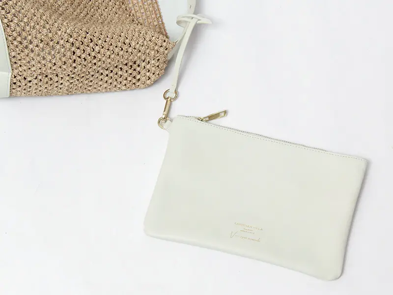 スマホや小物の整理に便利な大きめ(16×25cm)のフラットポーチが付属。ストラップで繋がっているため、バッグの中で迷子になる心配もありません。