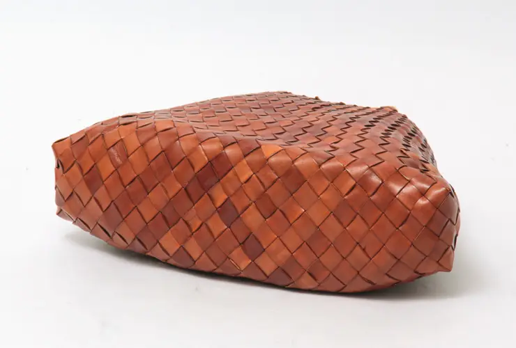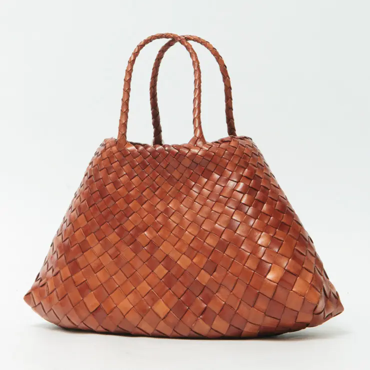 台形のシルエットが目を引く「SANTA CRRCE」シリーズのトートバッグ。上に向かって細くなるレザーコードを用い、サイドから底、ハンドルまで継ぎ目なく編み上げることで形作られた、クラフト感あふれるデザインです。どの角度から見ても美しく、ミニマルでありながら存在感のある佇まい。カジュアルスタイルにも上品なニュアンスを添えてくれます。底面にはレザーが施されており、フォルムを保ちやすいのも魅力です。