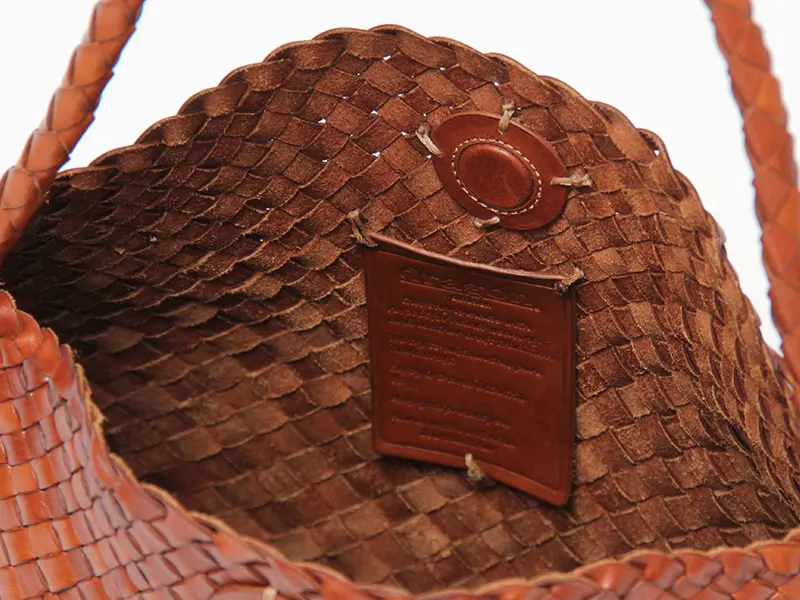 牛革の幅を調整しながら繊細に編み込まれたイントレチャート。天然素材をハンドメイドで編み上げているため、一点一点異なる風合いや色の濃淡があり、手仕事ならではの温かみを感じられるのが魅力。レザー特有の質感は、使い始めから柔らかく、時間とともにさらに深みのある表情へと育っていきます。
