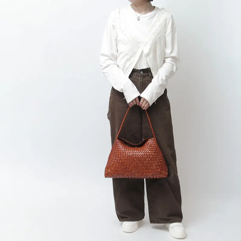 織物とレザーの産地として名高いインドにて、熟練の職人が一点ずつ手作業で編み上げたハンドメイドバッグ。ナチュラルな風合いは、リネンシャツやデニムなどのカジュアルスタイルにはもちろん、きれいめなワンピースのハズしアイテムとしても最適。カゴバッグのような軽やかさとレザーの気品を兼ね備えた素材感は、季節を問わずコーディネートに寄り添い、タイムレスに活躍します。