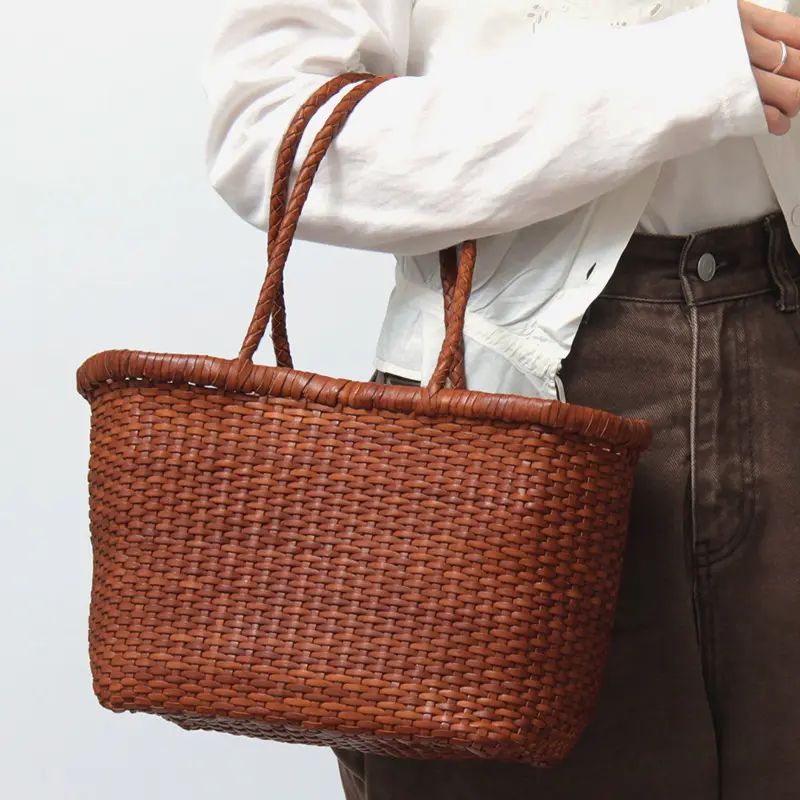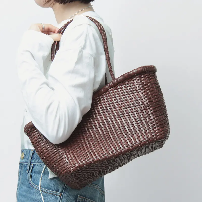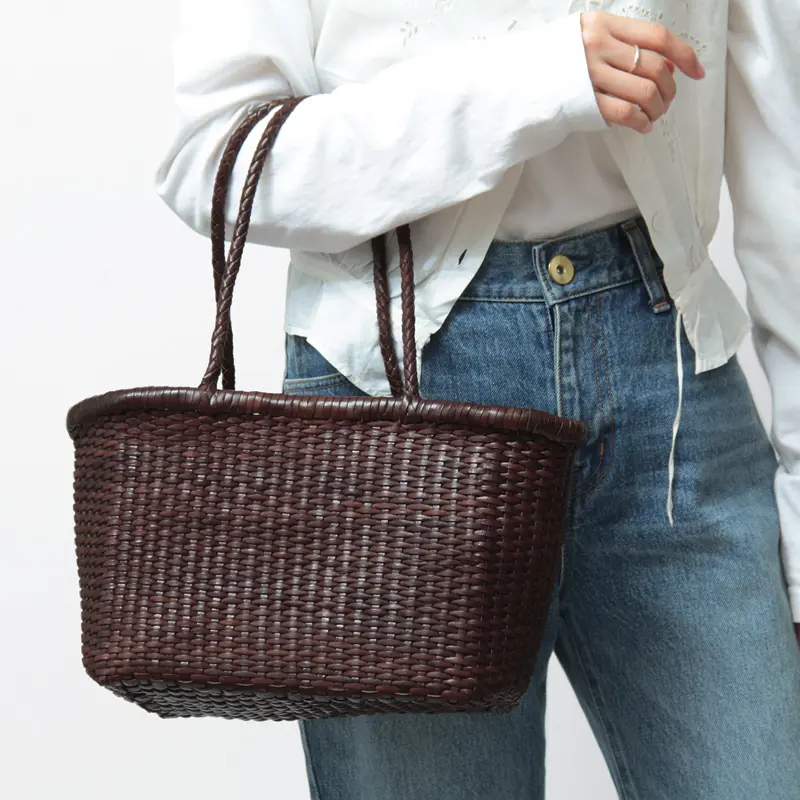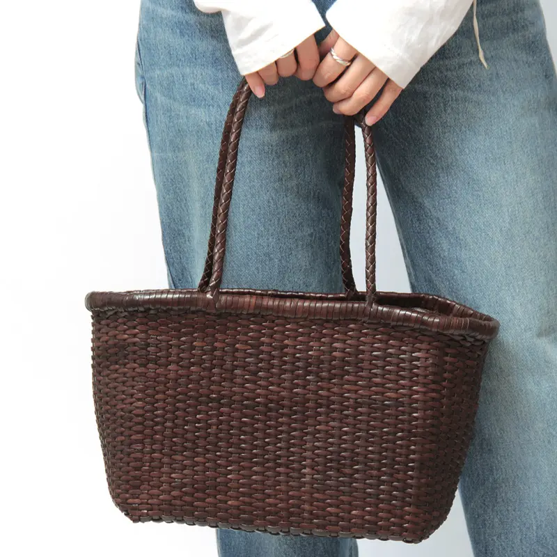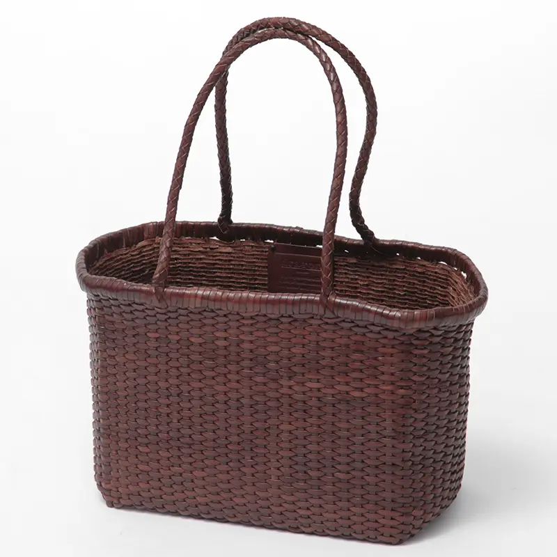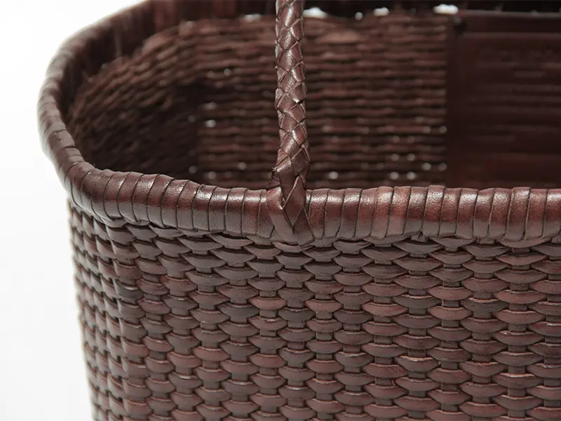 伝統的なBウィーブで丁寧に編み上げ、トップボーダーですっきりと仕上げたデザイン。クラシックなバスケットにインスパイアされた、時代を超えて愛されるシンプルな美しさが魅力です。天然素材をハンドメイドで編み上げているため、一点一点異なる風合いや色の濃淡があり、手仕事ならではの温かみを感じられます。レザー特有の質感は、使い始めから柔らかく、時間とともにさらに深みのある表情へと育っていきます。