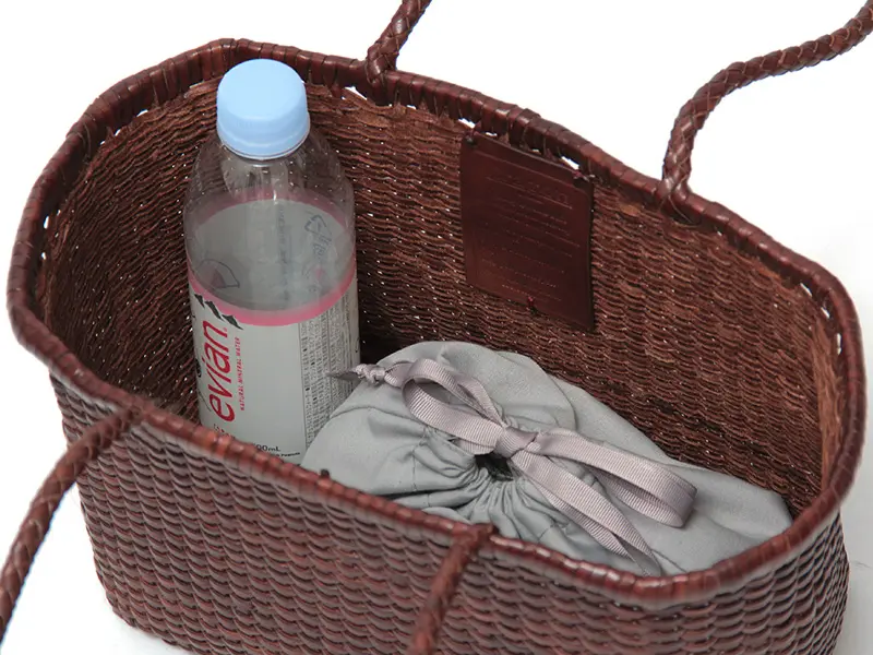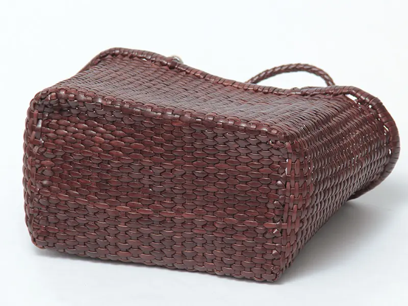 細身で華奢なハンドルは手に馴染みやすく、華奢なラインが女性らしさを引き立てます。本体と同じレザーを丁寧に編み込んでおり、耐久性も安心。ハンドル長は約45cm、立ち上がりは約19cmあるため、カットソーやブラウスなど薄手の季節には肩に掛けて軽快に持ち運ぶことができます。