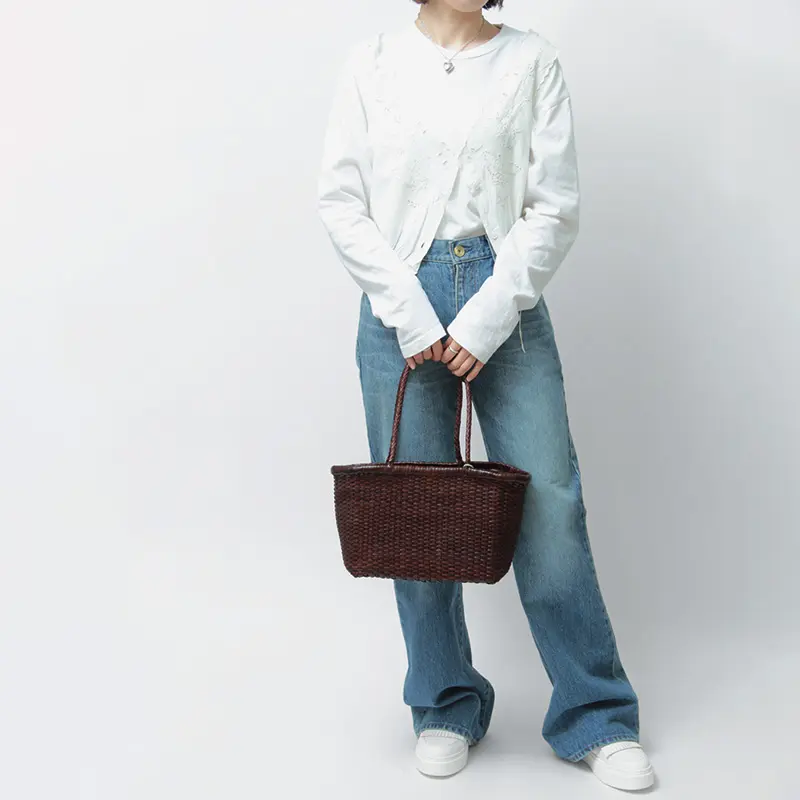 織物とレザーの産地として名高いインドにて、熟練の職人が一点ずつ手作業で編み上げたハンドメイドバッグ。ナチュラルな風合いは、リネンシャツやデニムなどのカジュアルスタイルにはもちろん、きれいめなワンピースのハズしアイテムとしても最適。カゴバッグのような軽やかさとレザーの気品を兼ね備えた素材感は、季節を問わずコーディネートに寄り添い、タイムレスに活躍します。