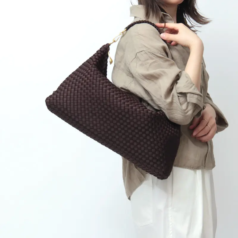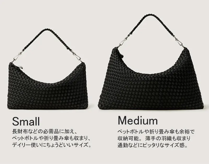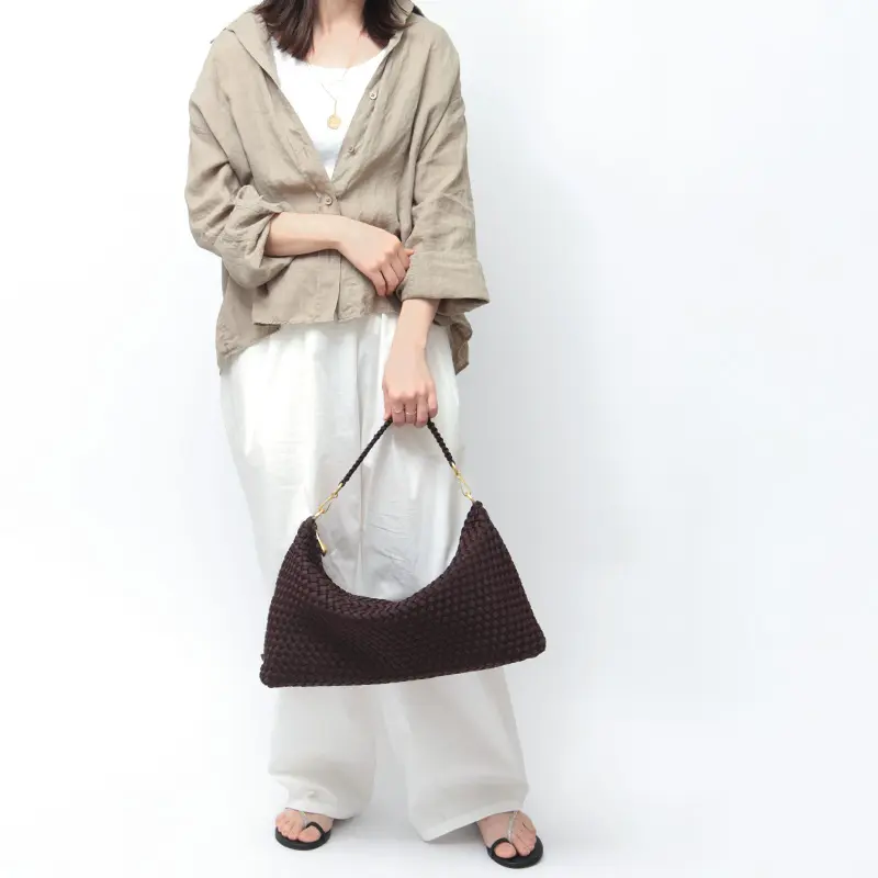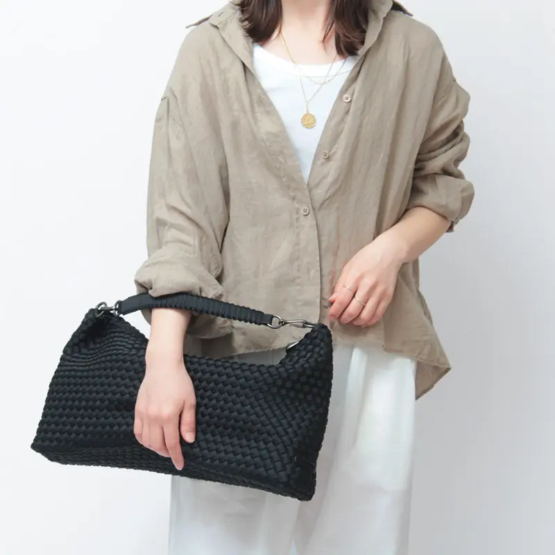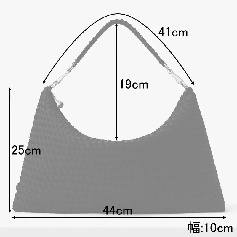 軽量で耐久性に優れた弾力のある高密度フォーム素材を採用し、女性のライフスタイルにフィットするバッグを展開するNY発ブランド "Naghedi/ナゲティ"。 ダイビングスーツなどにも用いられる高機能素材を丁寧に編み込んだ、メッシュデザインの上品なショルダーバッグです。B5サイズが横に収まる、少し余裕のあるサイズ感で、必需品+αの荷物をスマートに収納可能。肩掛けしやすいワンハンドル仕様で、通勤バッグとしてはもちろん、旅行などにも活躍します。