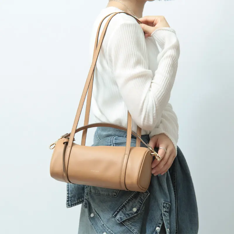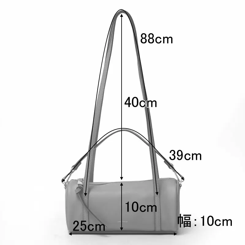 コロンとしたコンパクトなフォルムに、長めのハンドルを組み合わせることで、肩掛けしたときのバランスも美しく仕上げられています。シンプルながらも印象に残るデザインで、スタイリングのさりげないアクセントに。取り外し可能なストラップ付きで、ハンドバッグとしても使える2WAY仕様。必要なアイテムをコンパクトに持ち歩ける、デイリーにちょうどいいサイズ感です。