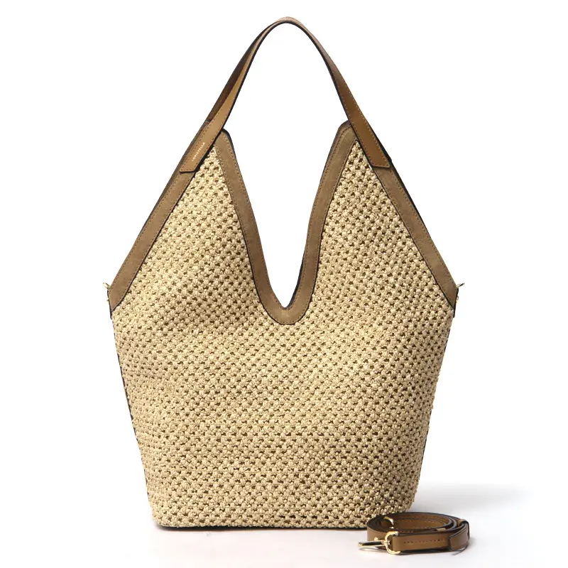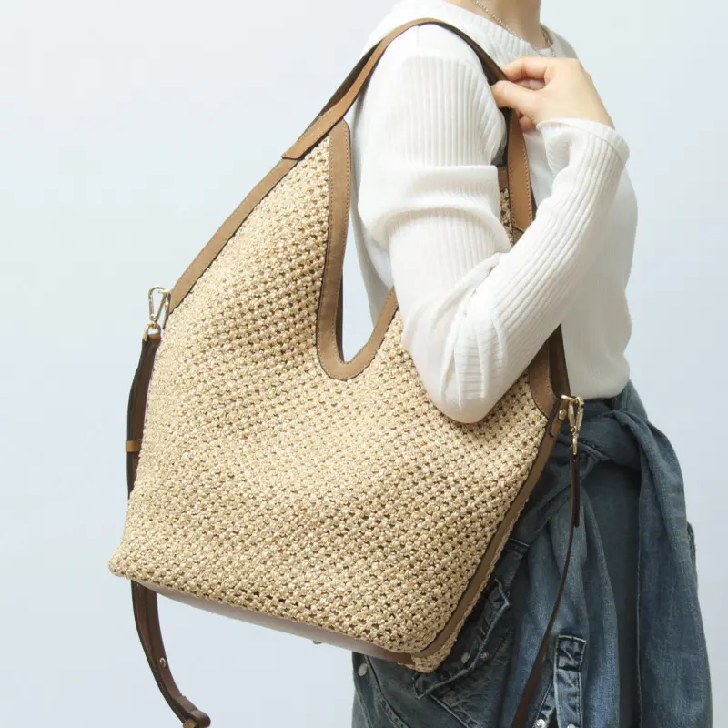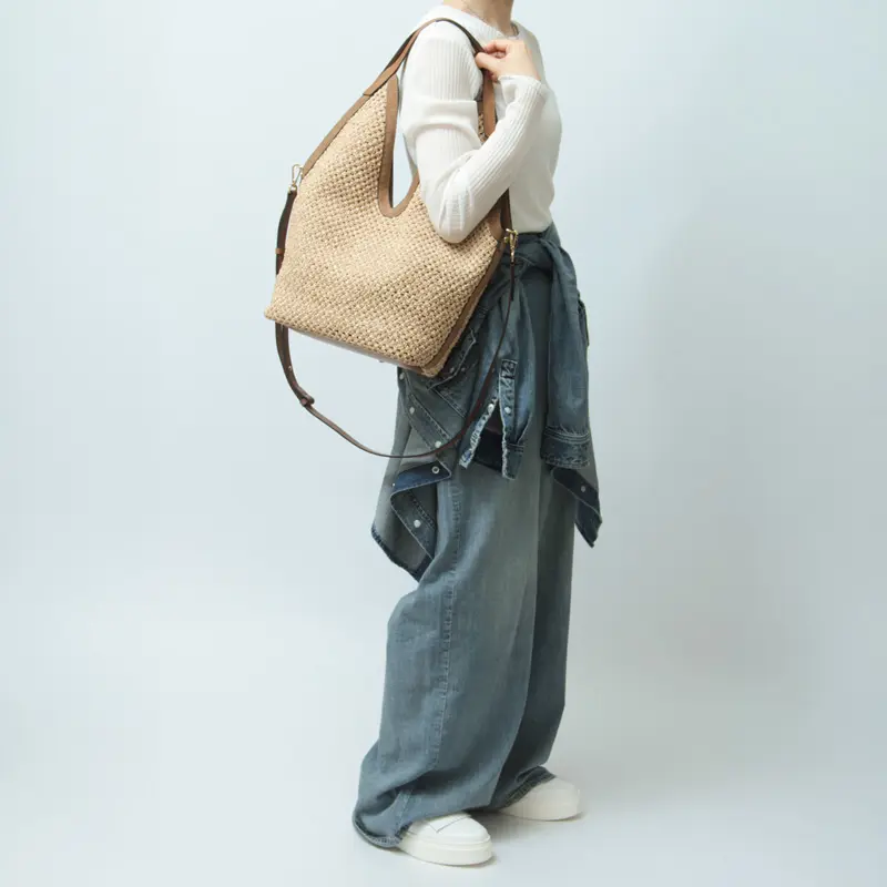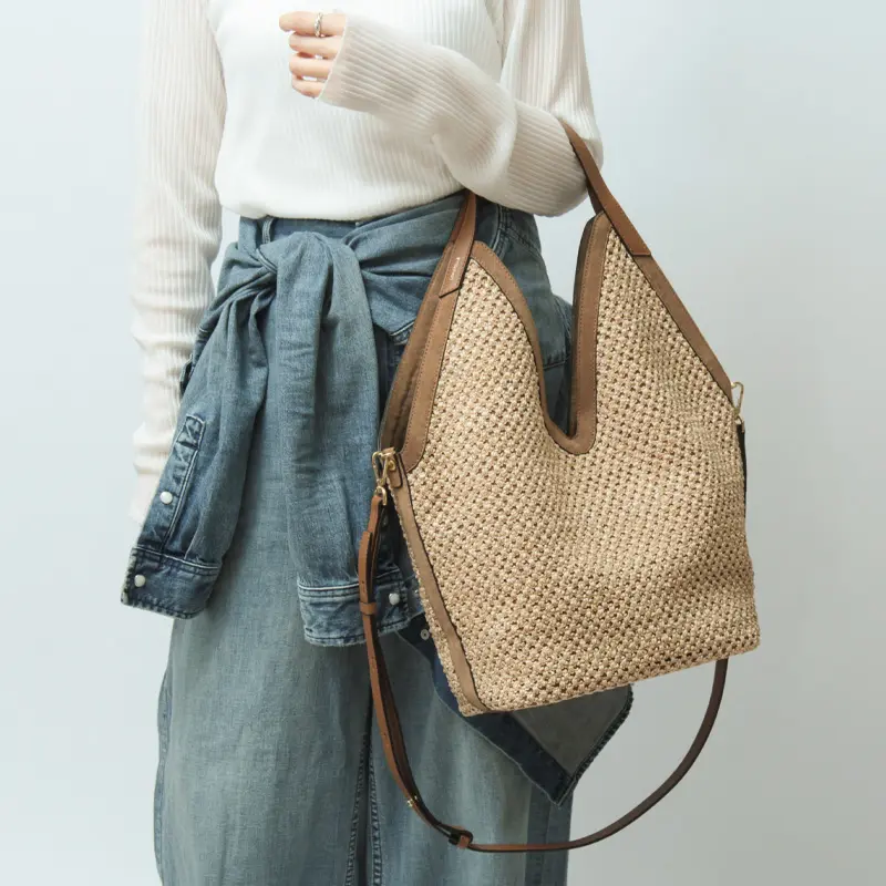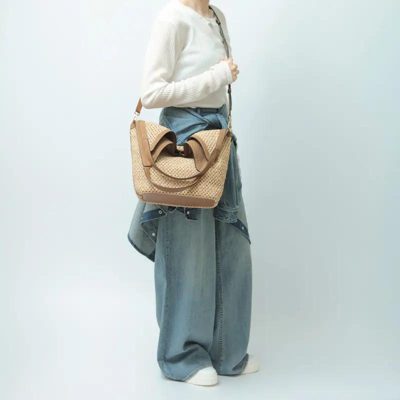 ストローとスエードの異素材コンビが魅力のカゴバッグ。丁寧に編んだ軽やかなストローに上品なスエードをあわせ、夏らしい涼しげな印象と上質感を両立しました。裏地はなく柔らかい仕立てで、自然な動きが楽しめます。