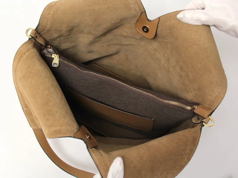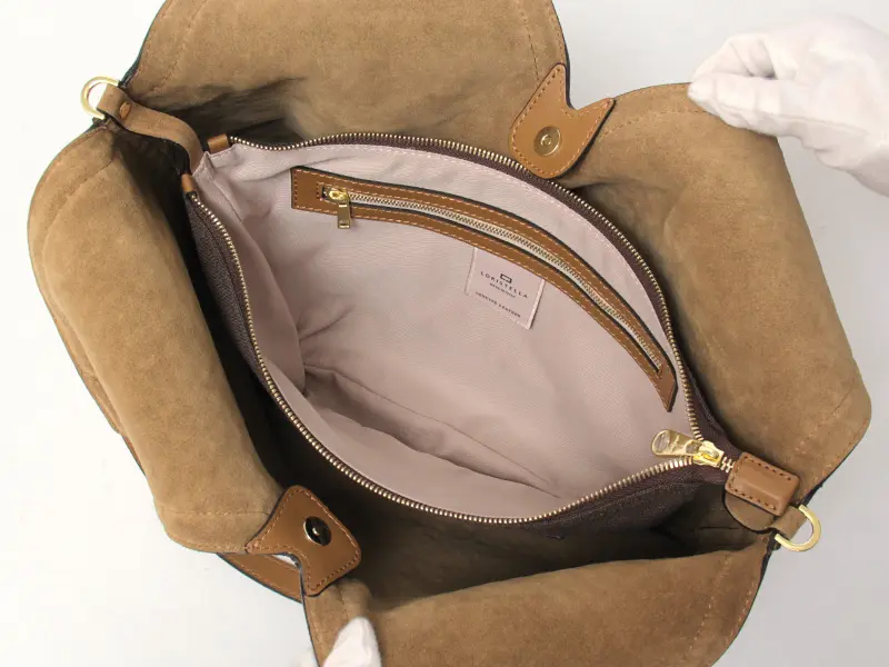 開閉はマグネット仕様。裏地のない仕立てで、柔らかく軽やかな仕上がりです。インナーポーチ付きで、お財布などの貴重品も安心して収納可能。ポーチの外側と内側にポケットがついており、小物も整理しやすく収納できます。必需品に加えて、ペットボトルや折り畳み傘なども入れていただけます。