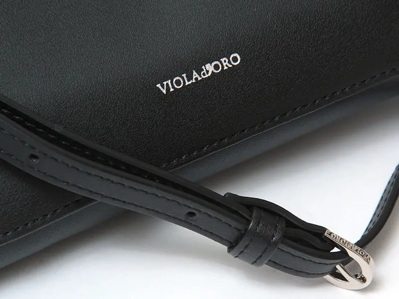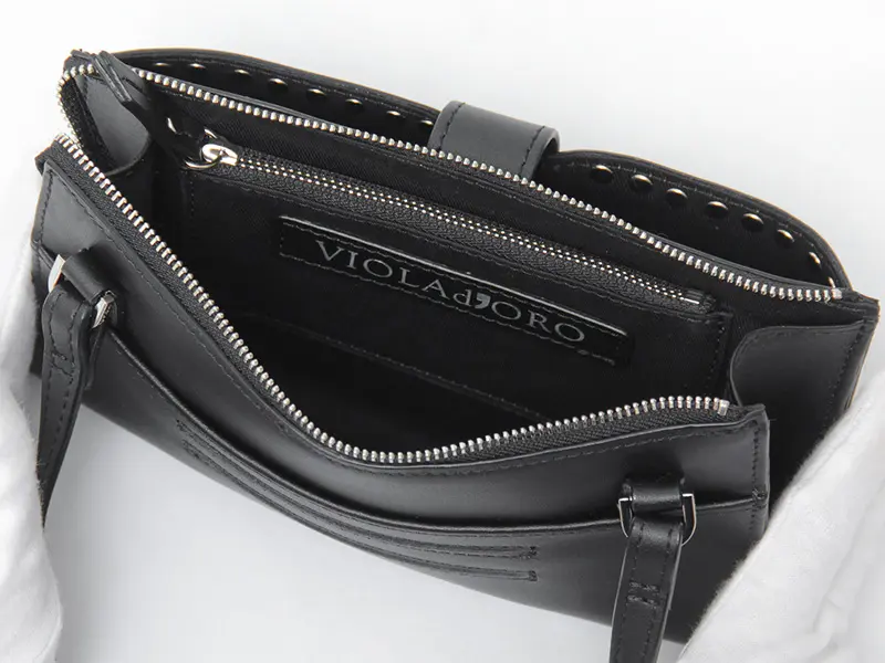 ミニマルなフォルムの縁を飾るのは、職人の手で丁寧に配されたシルバースタッズ。甘すぎずハードすぎない絶妙なバランスは、自分らしいスタイルを持つ女性にふさわしいVIOLAd'OROならではのデザインです。金具をシルバーで統一することで、お手元のアクセサリーとも美しく調和。シンプルな装いに溶け込みつつ、大人の日常をクラスアップさせます。