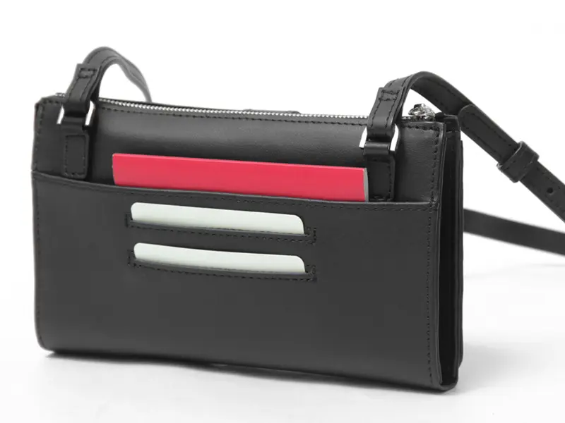 背面には2箇所のカードスロットと、パスポートも収まる深めのオープンポケットを完備。ICカードの提示やチケット類の一時保管に便利で、旅行や出張でも活躍します。無駄のない導線で、必要なものをスマートに取り出せる機能美が快適な移動をサポートします。
