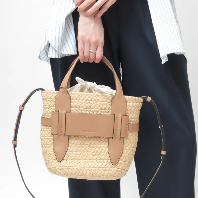 ラフィアの涼しげな編み模様に、本革ハンドルが夏の装いを格上げする洗練デザイン。リラックス感のある大人カジュアルスタイルにマッチし、旅行や週末ランチ、お買い物スタイルまで幅広く活躍します。