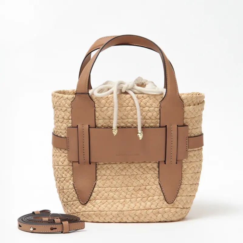 取り外し可能なレザーストラップ付きで、ハンドバッグとしてもショルダーバッグとしても使える2WAY仕様。上質感漂う牛床革をあしらったディテールが、ナチュラルな素材に品のある印象をプラスします。