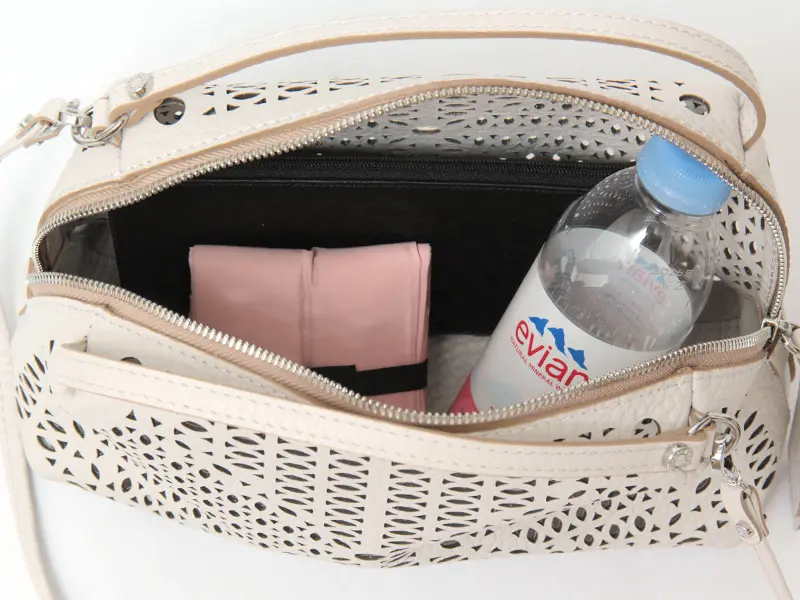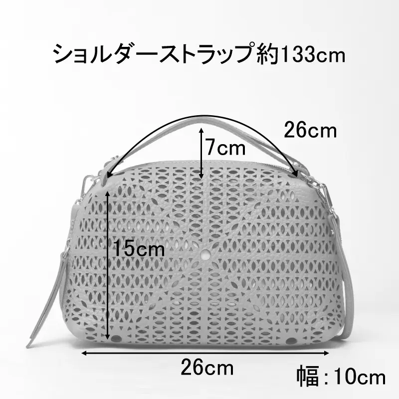 裏地のない仕様で、カットワークの繊細な表情をダイレクトに楽しめるデザイン。丸みのあるコンパクトなフォルムながら、長財布や330mlのペットボトルが収まる実用的なサイズ感が魅力のショルダーバッグ。スマートフォンやミニポーチなど、日常の必需品をすっきりと収納できます。開閉は安心感のあるファスナー仕様で、中身が見えにくく移動時も安心。見た目の美しいバランスを保ちながら必要なものをきちんと収める、デザイン性と実用性を兼ね備えた一品です。
