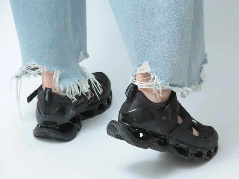 ソールの厚みは約4cm。プラットフォームが約2.5cmあるので高低差を感じにくく、さりげなく脚を長く見せてくれるバランス設計。反り上がったつま先が蹴り出しをサポートし、足運びもスムーズ。ミッドソールには、2枚の波型プレートを組み合わせた“MIZUNO”独自の「INFINITY WAVE(インフィニティウェーブ)」を搭載し、高い安定性とクッション性を発揮。スポーツブランドならではの弾力性に富んだ快適な履き心地を実感できます。