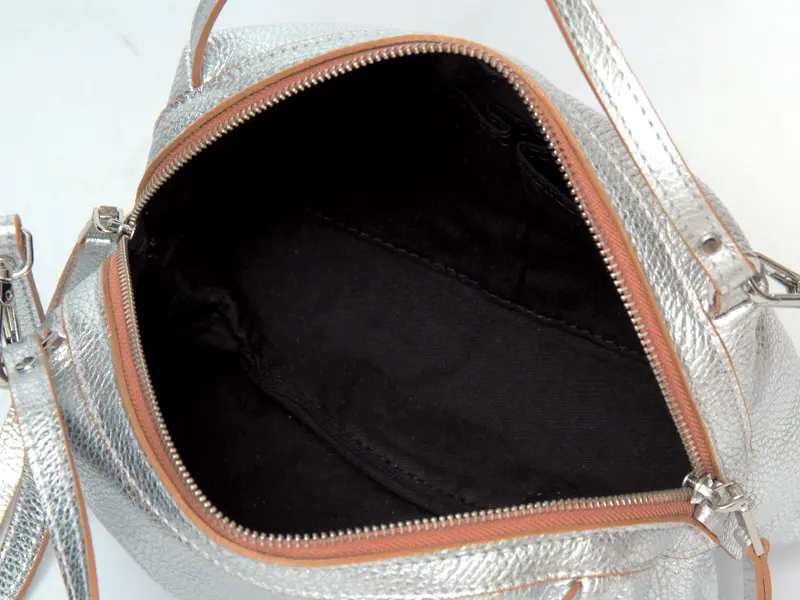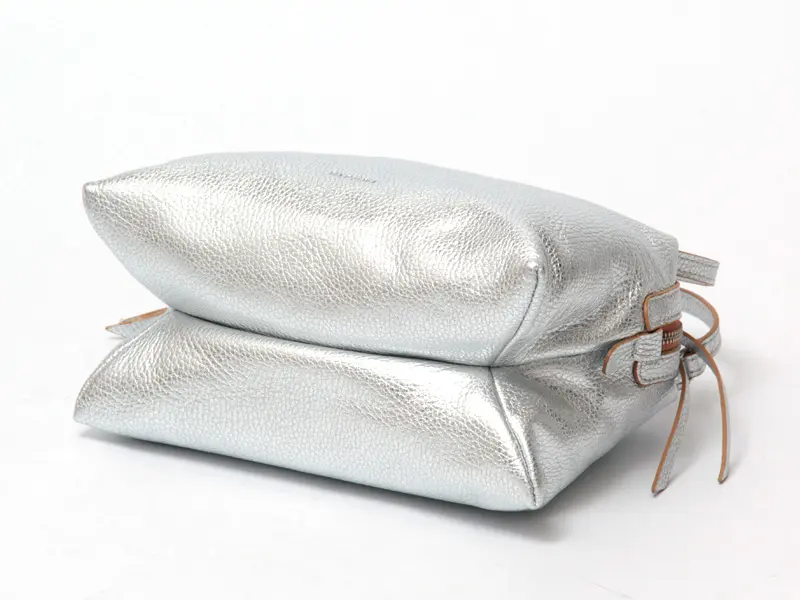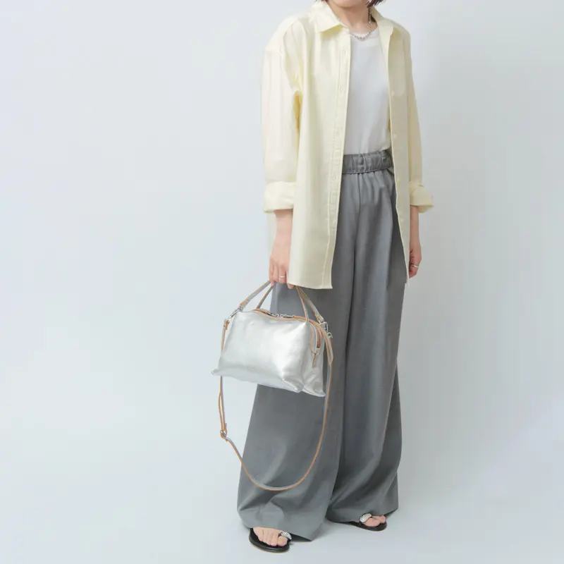 シボの表情が美しい牛革を使用。細かな凹凸が上品な陰影を生み、シルバーのメタリックな輝きがさりげない華やかさを添えながら、シンプルなデザインに奥行きを与えます。程よいハリとコシを備えつつ、手にしたときのやわらかさも感じられる質感が魅力。日常使いでも扱いやすく、使うほどに手に馴染み、風合いの変化も楽しめます。