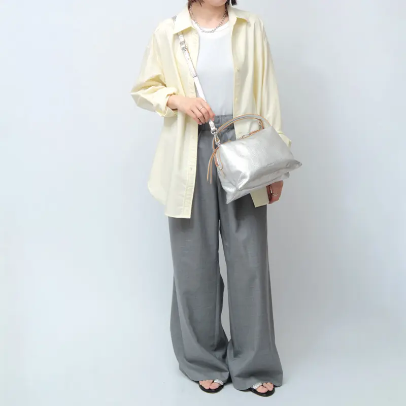 ハンドで上品に、クロスボディで軽やかに。どちらの持ち方でもバランスよく決まるミディアムサイズのトートバッグです。ショルダーストラップは取り外し可能で、長さ調節にも対応。その日のスタイリングやシーンに合わせて、持ち方を自在にアレンジできます。上品に映えるシルバーの輝きがコーディネートに程よいアクセントを添え、日常からお出かけまで幅広く活躍します。