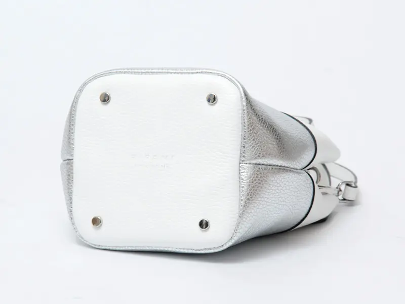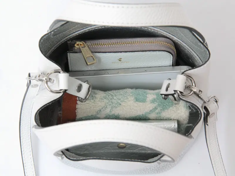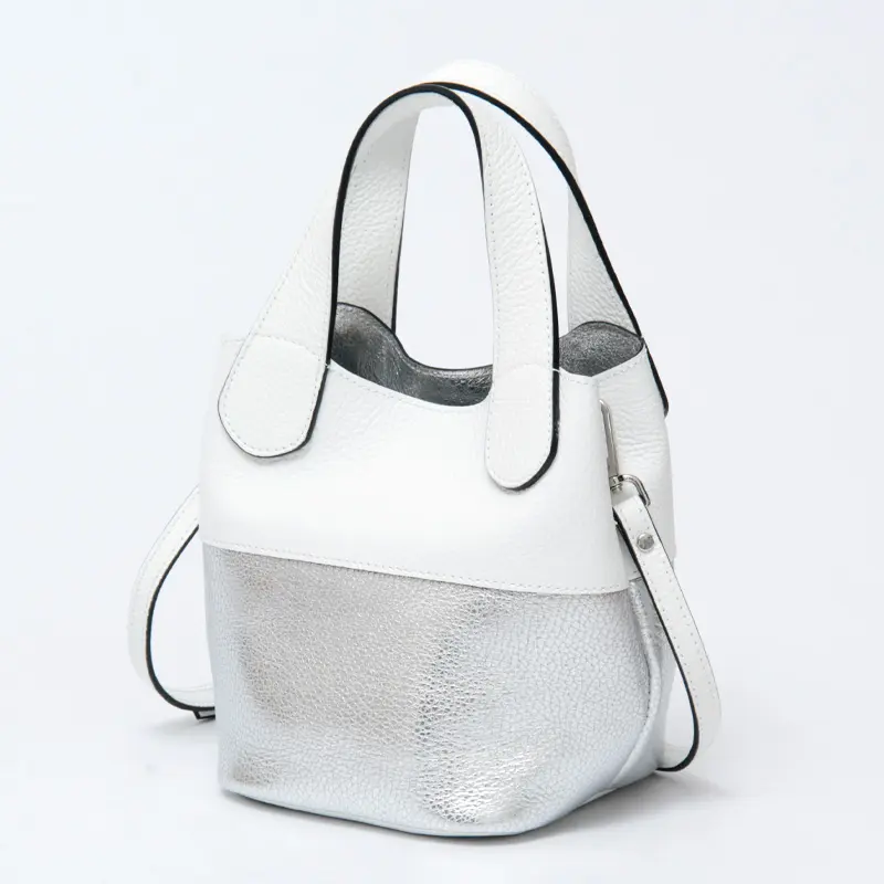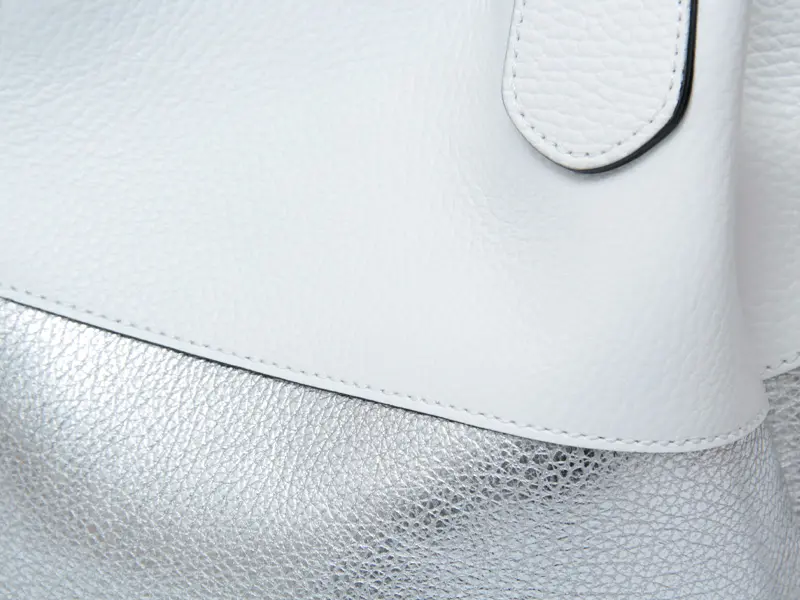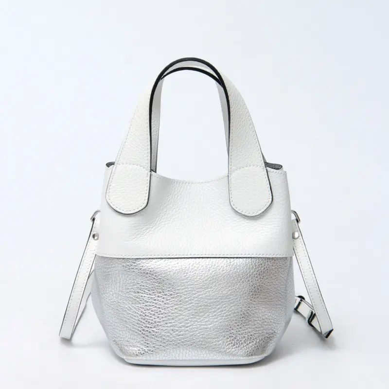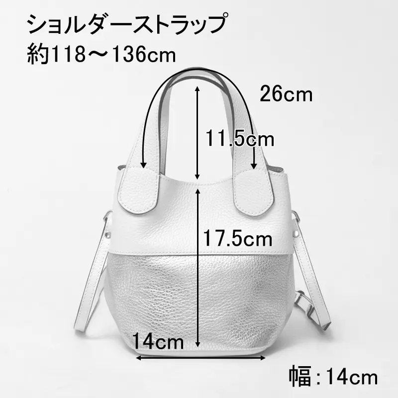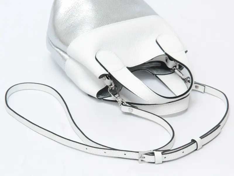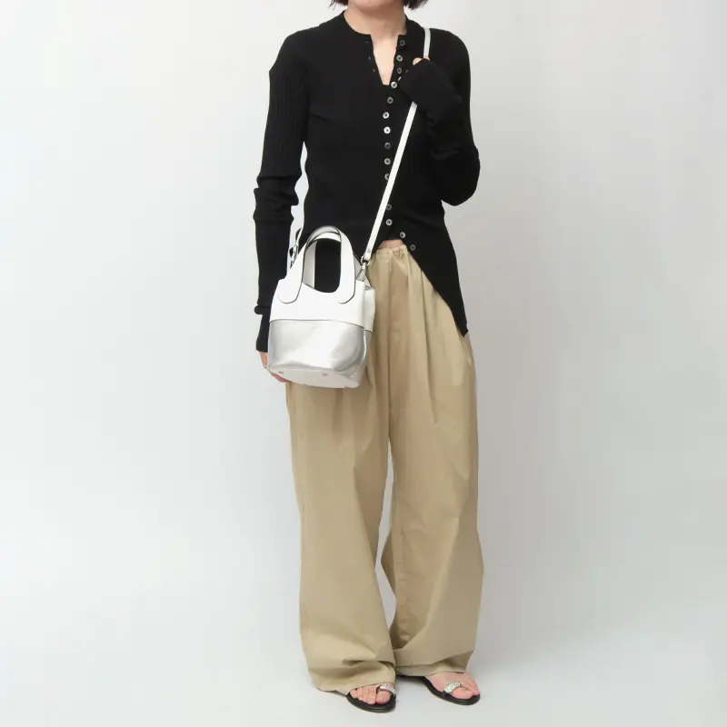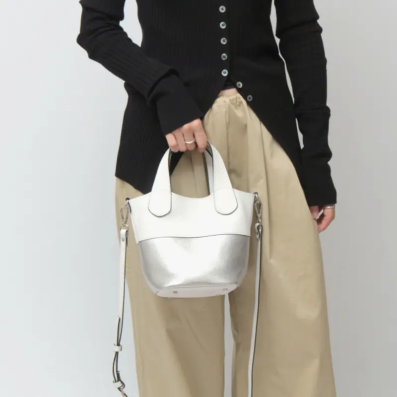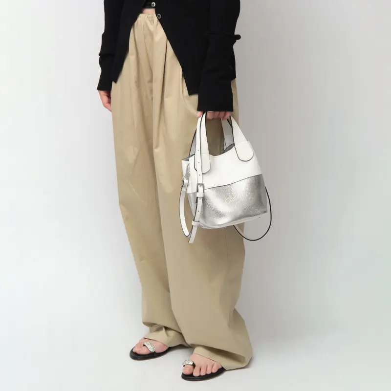 白とシルバーを組み合わせたバイカラーの牛革を使用。さりげないコントラストが、装いに軽やかさと上品な華やぎを添えます。シボの表情が美しく、傷が目立ちにくいのも魅力。程よいハリと柔らかさを兼ね備えた質感で、手にしたときの心地よさもポイントです。日常使いにも取り入れやすく、長く愛用できる素材に仕上がっています。