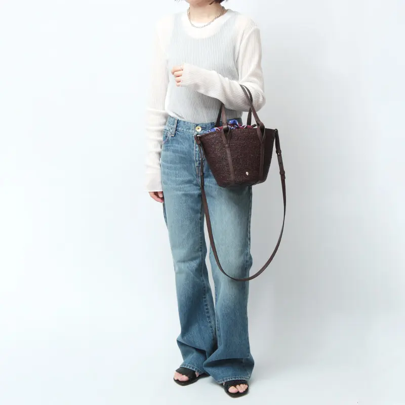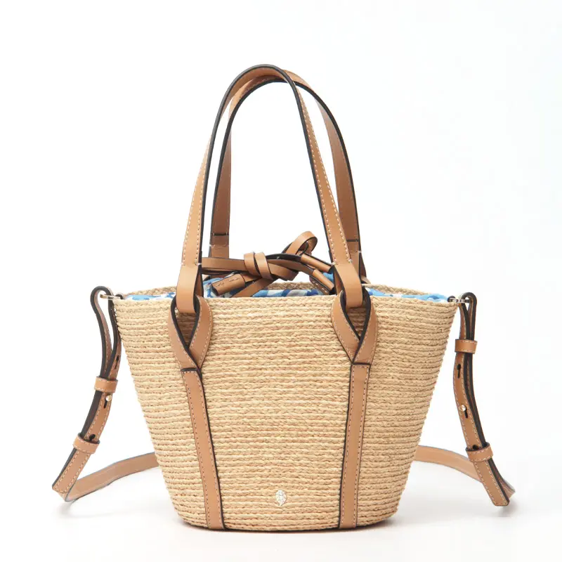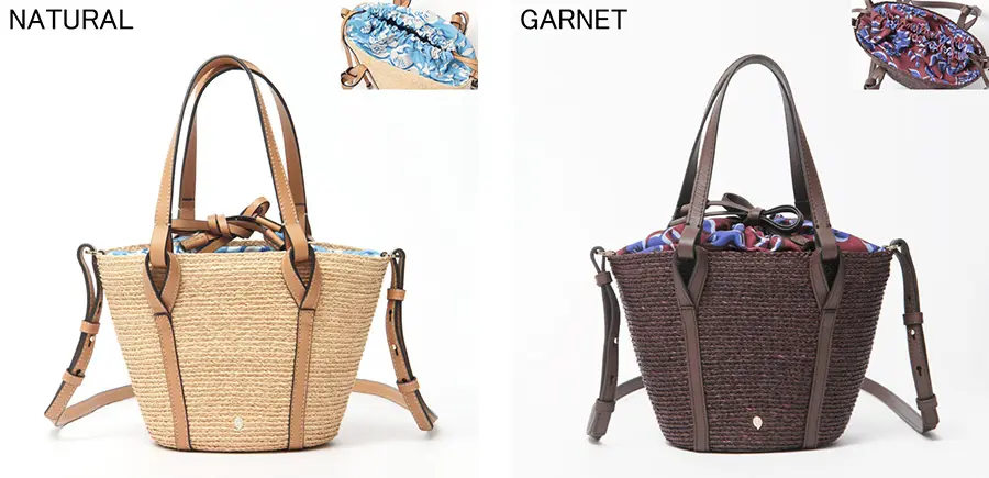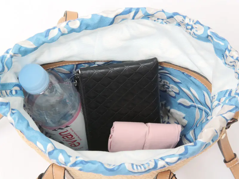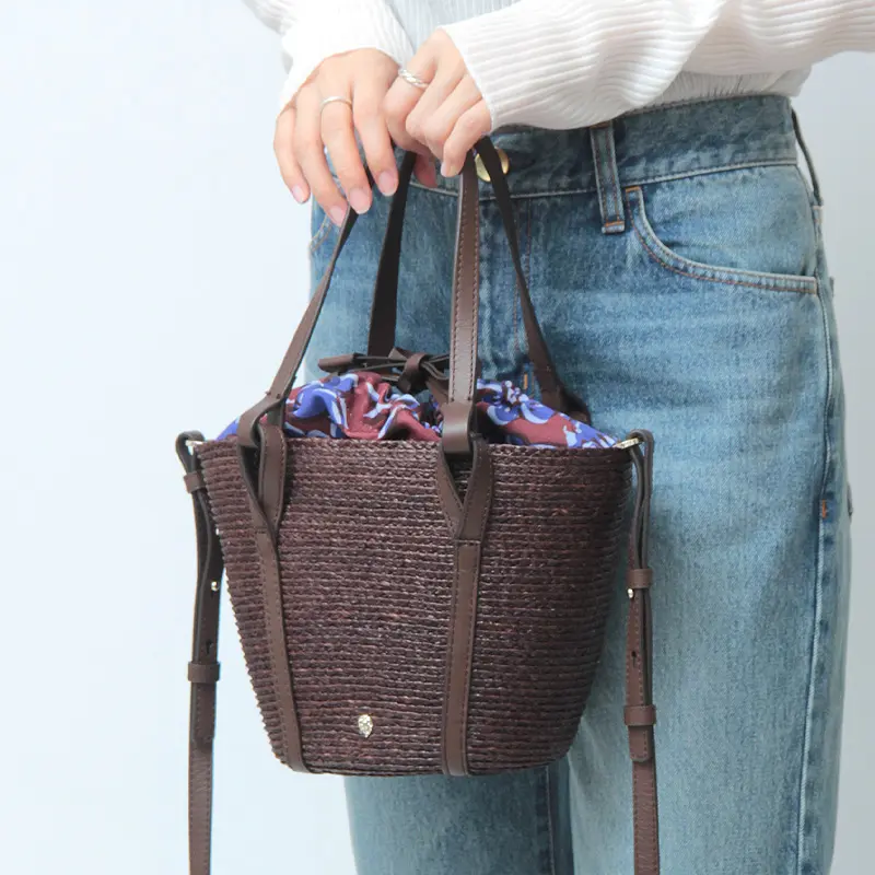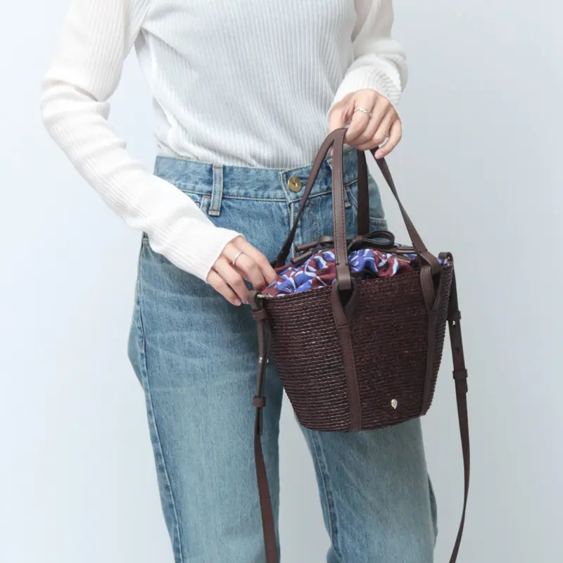 天然素材ならではの涼やかな風合いに、レザー使いがほどよい引き締め感を添えたバスケットバッグ。ハンドルやステッチまで丁寧に仕上げられ、上質さがさりげなく伝わります。ちらりと見えるプリント生地がアクセントとなり、装いに奥行きをプラス。ショルダーストラップは取り外し・長さ調節が可能な2way仕様で、リラックス感のある大人カジュアルに馴染み、旅行やお出かけなど幅広いシーンで活躍します。