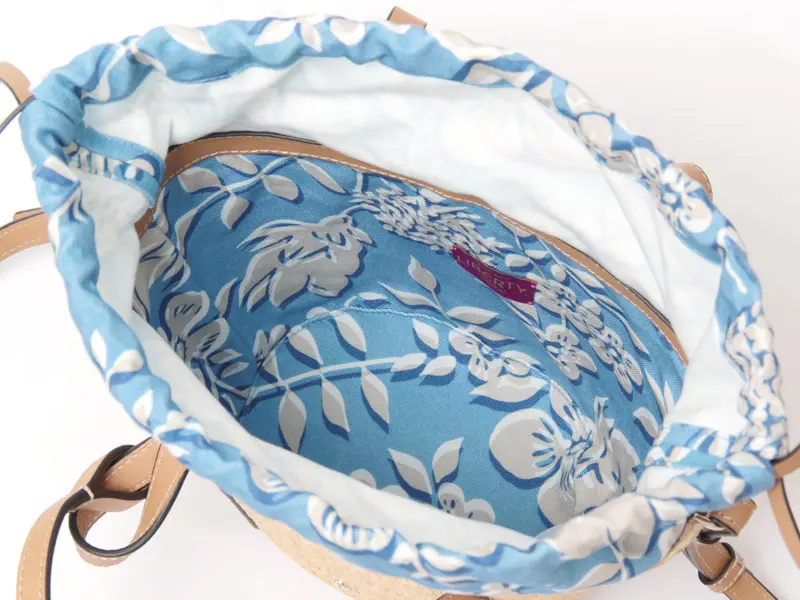 500mlペットボトルや長財布、エコバッグなどが収まる、普段使いにちょうどいいサイズ感。見た目以上の収納力で、外出に必要なアイテムをすっきりとまとめられます。インナーにはリバティ社のファブリックを使用し、荷物を取り出すたびに気分が高まるデザインに。