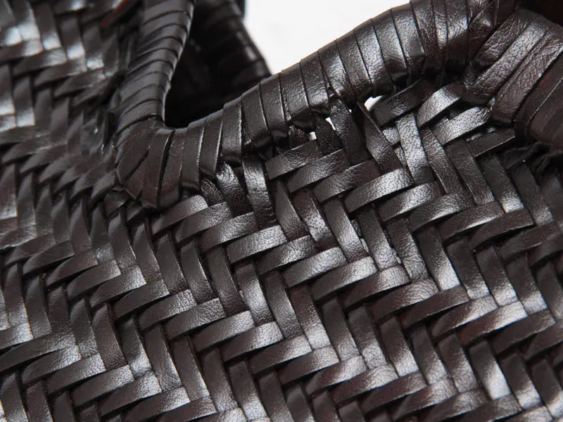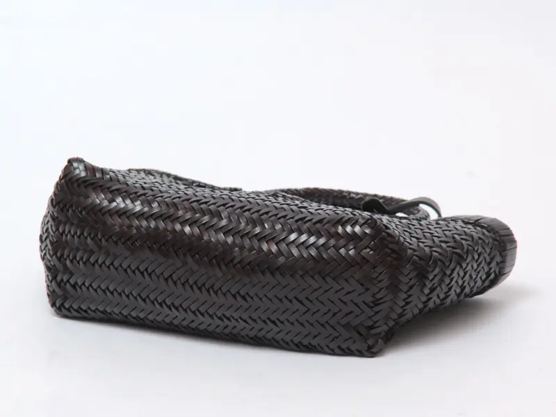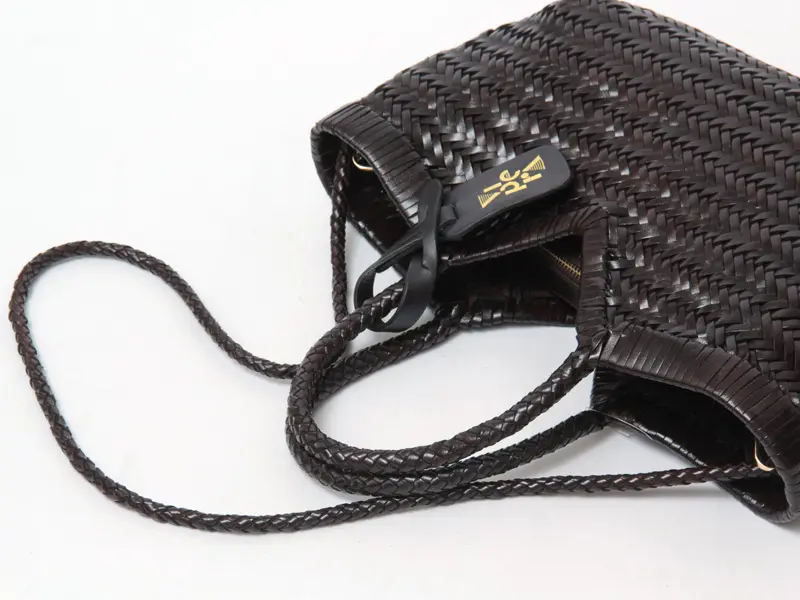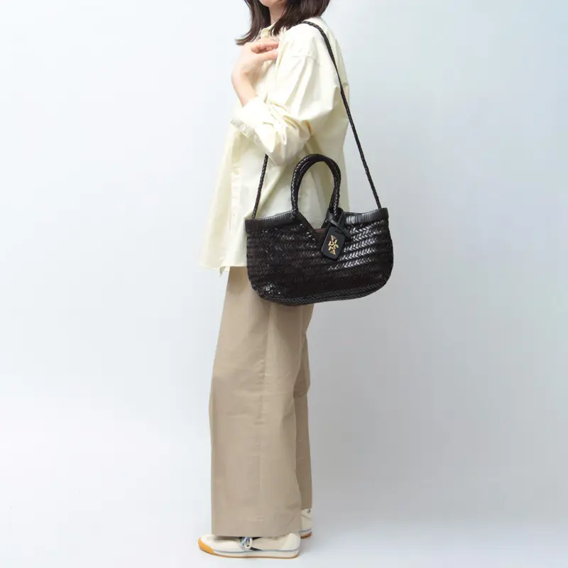 ハンドでも、肩掛けでも使える2way仕様。シーンや装いに合わせて、持ち方を選べます。ショルダーストラップは本体と一体型で取り外しはできませんが、バッグと同様に丁寧に編み上げたレザーを採用し、統一感のある美しい仕上がりに。細部までこだわりを感じるデザインです。