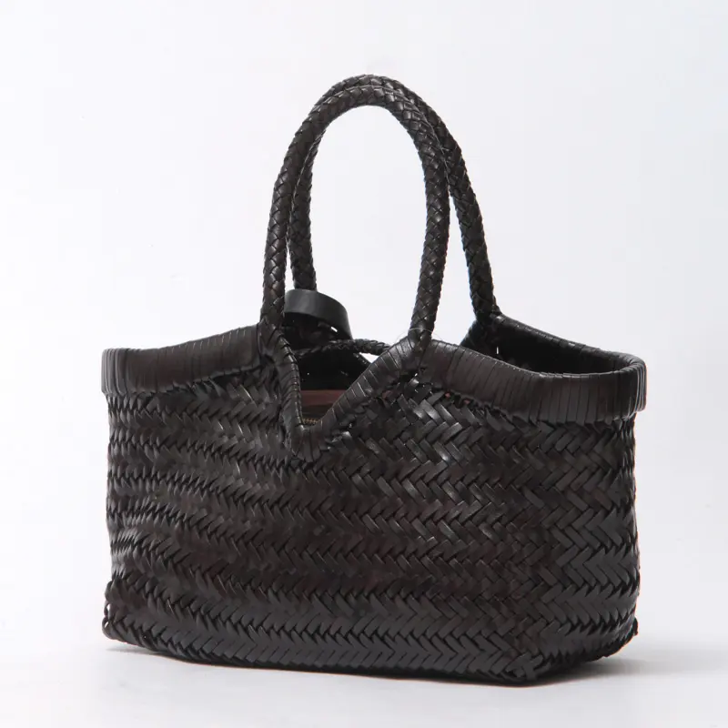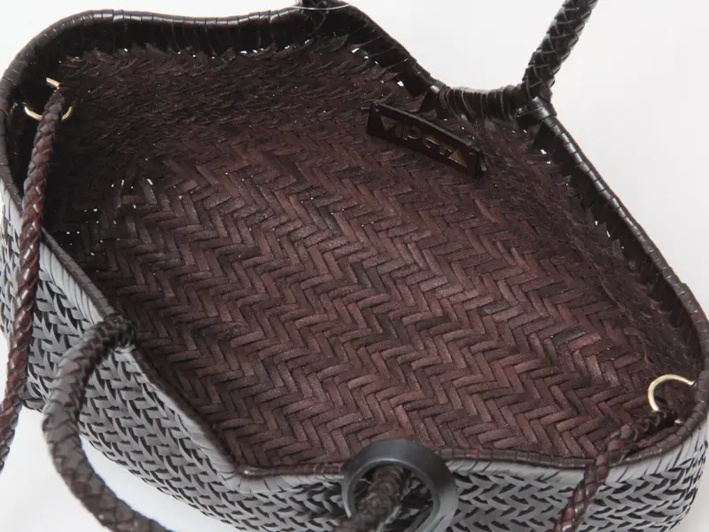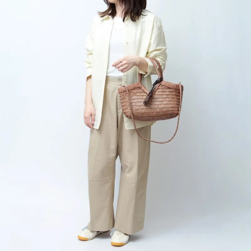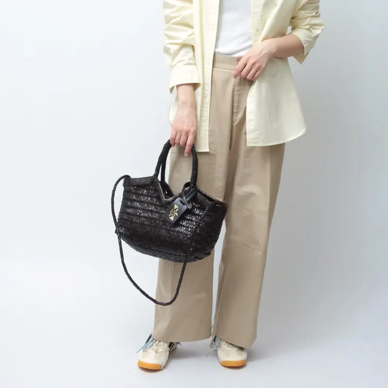 織物とレザーの産地・インドで、熟練の職人が一点一点手作業で編み上げたハンドメイドバッグ。牛革を繊細に編み込んだイントレチャートは、温かみのある表情と滑らかな質感が魅力です。使い込むほどに柔らかくなり、深みのある色艶へと変化する経年変化も楽しめます。イタリアでデザインされ、伝統的な手仕事を受け継ぐ技術によって仕立てられた、季節を問わず愛せるタイムレスな一品です。