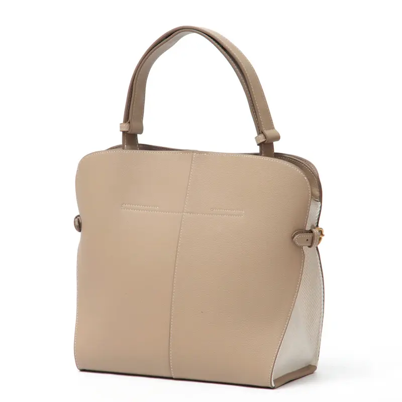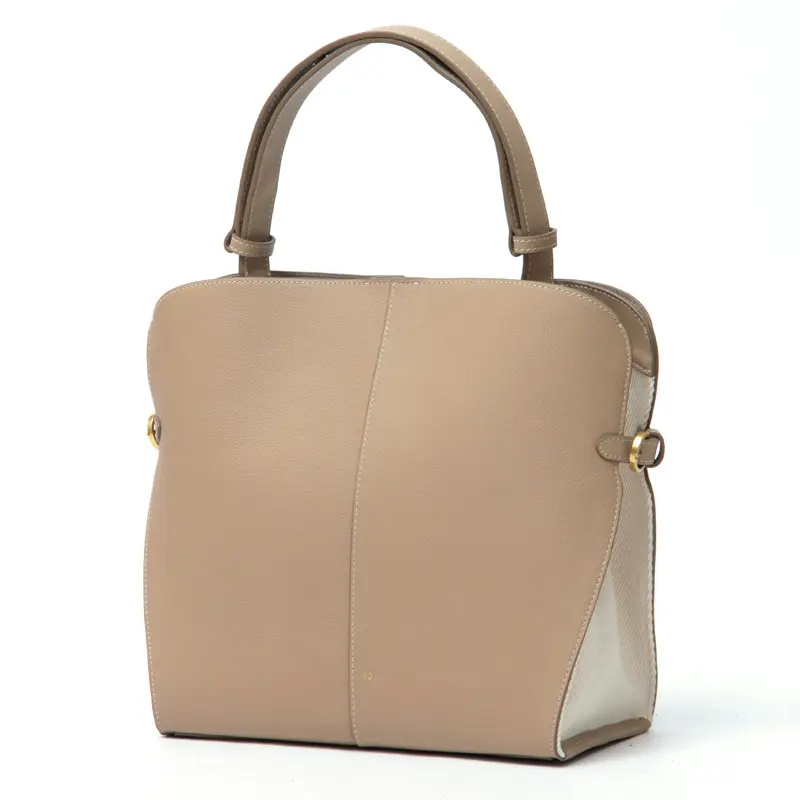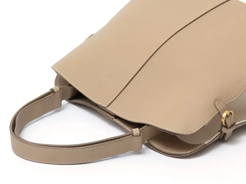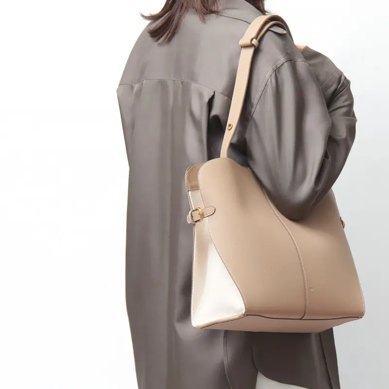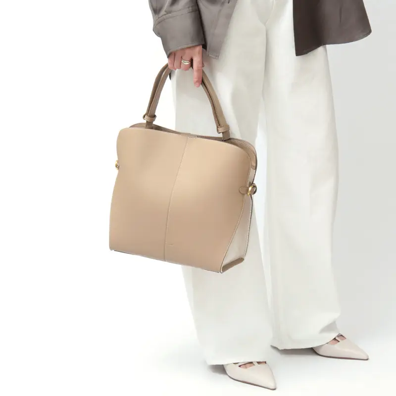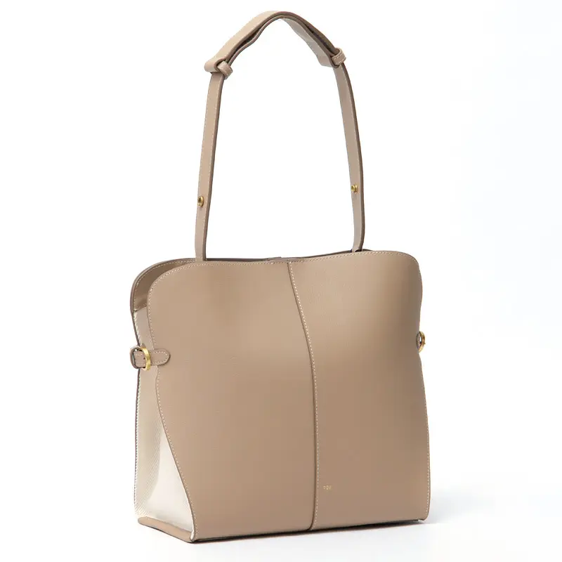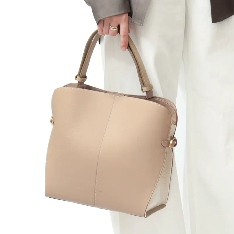 上質なシュリンクレザーとファブリックを組み合わせた、TOV(トーヴ)の「RIEN(リアン)」シリーズ。サイドのバックルでフォルムを保つ計算されたシルエットが特徴で、シンプルながらも立体感のある佇まいに仕上げています。細かなシボ感のあるレザーに、配色ステッチがさりげないアクセントを添え、軽やかさと上品さを両立。オンオフ問わず活躍する、実用性にも優れたワンハンドルバッグです。