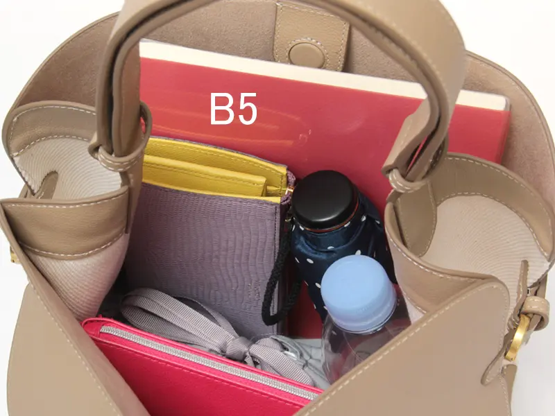 B5サイズのノートが縦にゆとりをもって収まるサイズ感。マチ広で、長財布やポーチに加え、500mlペットボトルや折りたたみ傘、お弁当箱なども収納可能。見た目はすっきりとしながらも、日常に必要なアイテムを無理なく持ち運べます。マチもしっかりあり、荷物を整理しやすい設計もポイントです。