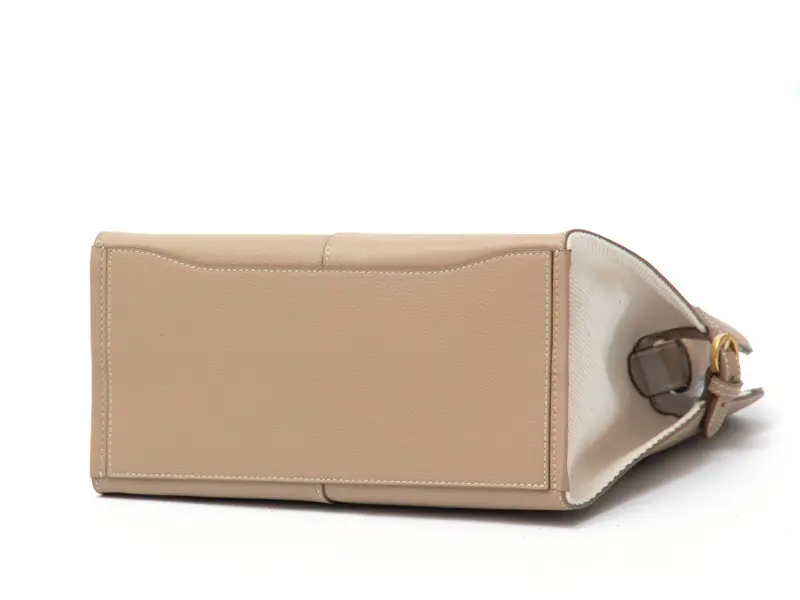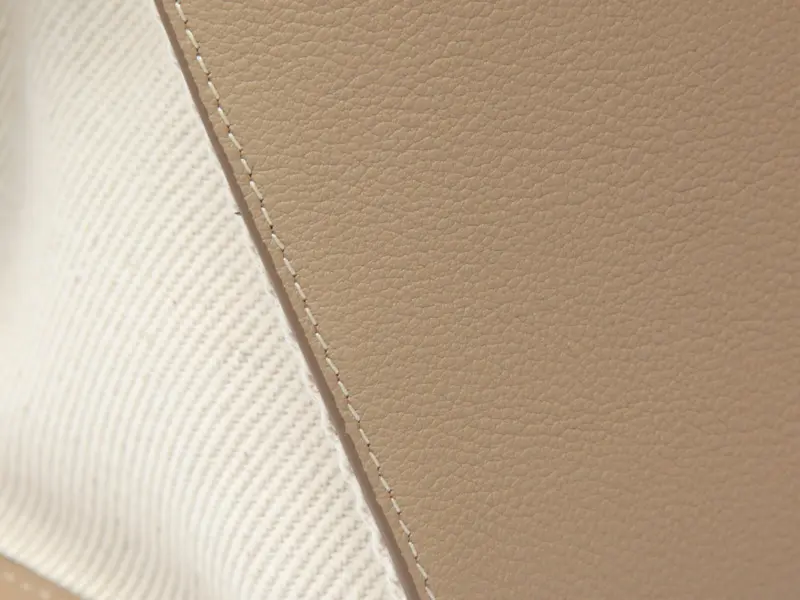 本体には、きめ細かなシボ感が美しい牛革を使用。控えめな艶が品のある表情を引き立て、日常のスタイリングに自然と馴染みます。サイドにはファブリック素材を組み合わせることで、見た目に軽やかさをプラスし、かしこまりすぎないバランスに。さらに配色ステッチがさりげないアクセントとなり、シンプルな中にモダンなニュアンスを添えています。異素材のコントラストが際立つ、洗練された仕上がりです。