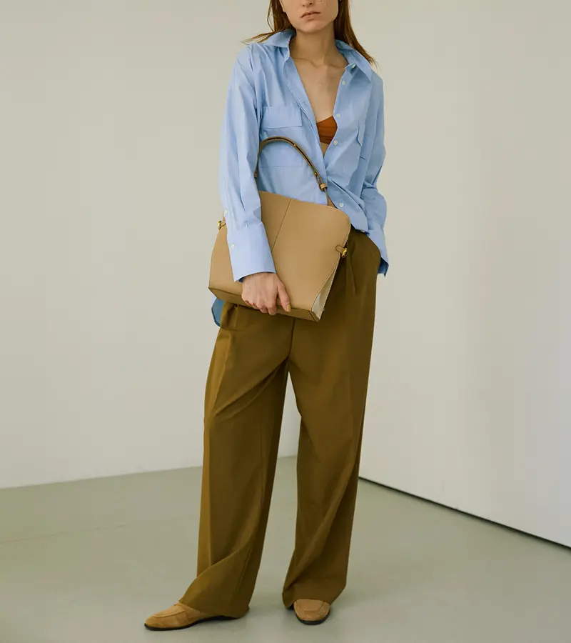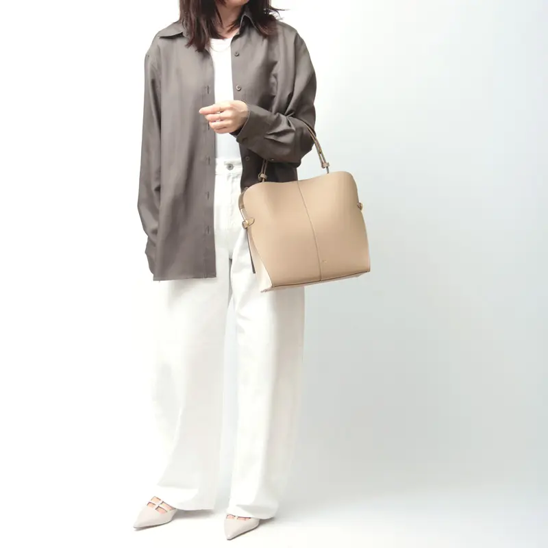 すっきりとしたフォルムに程よい抜け感を加え、きれいめな装いにも自然に馴染みます。シンプルながらも機能性を備えたデザインで、日常に寄り添う使い心地の良さも魅力のトートバッグです。