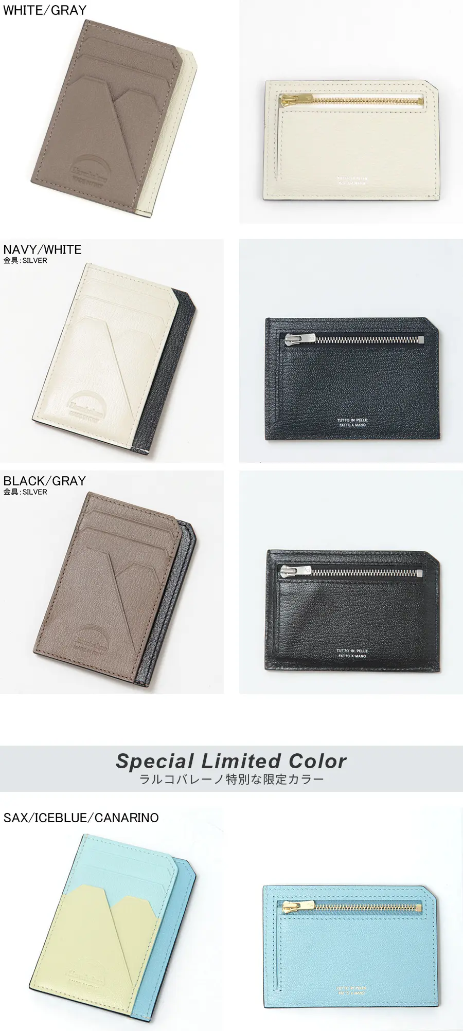 フランスの高級老舗タンナーアルラン社の美しい発色と細やかな型押しの山羊革を使用しています。繊維が細かく、軽くて、耐久性に優れた、傷のつきにくい素材で、仕立ても良く、長くご愛用いただけます。レザーには素押しのラルコバレーノの刻印と、オールレザー・オールハンドメイドの証、"TUTTO IN PELLE FATTO A MANO"が刻まれています。