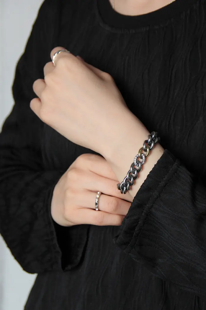 日本人デザイナーが手掛けるジュエリーブランド"hum ハム"。 永遠を意味する"エタニティ"が語源となったhumが提案するエターナルなスタンダード="humete collection ハムエタコレクション"。切れ目なく永遠に続く鎖と、永遠の絆という宝石言葉を持つダイヤモンドにも、"永遠"という意味が込められています。 燻したシルバーチェーンにゴールドとダイヤモンドの輝きを加えたラグジュアリーなブレスレット。存在感がありながらも、上品な手元を演出します。同シリーズのリングと合わせたり、お手持ちのアクセサリーとの組み合わせもお楽しみください。