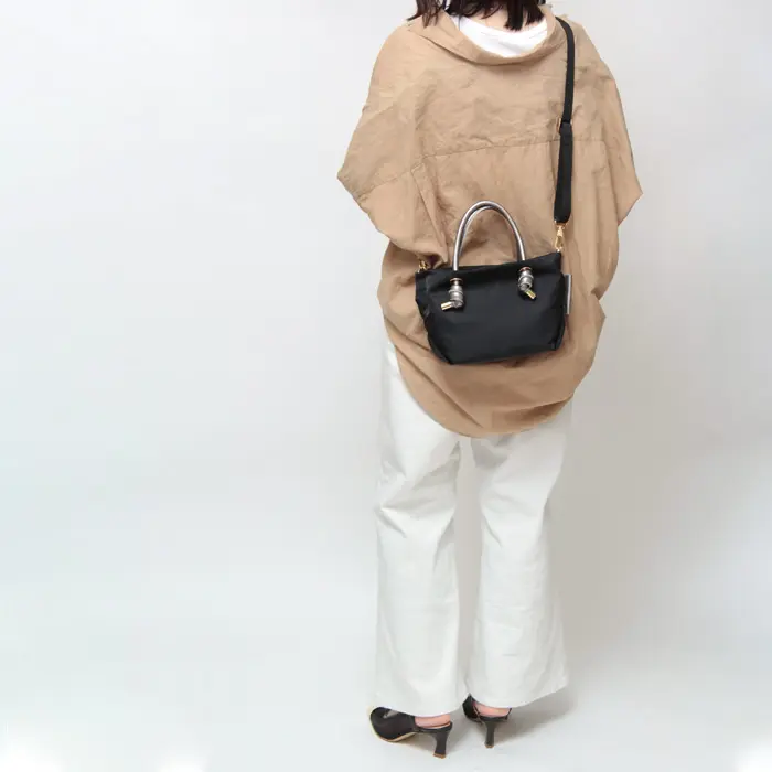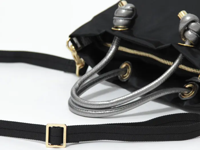 ノット(結び目)がポイントのハンドルはレザー仕立てでナイロンのカジュアル感に上品さをプラスします。ショルダーストラップが付いているので斜めがけもできる2way仕様。お出かけやお子様とのお出かけもにも最適です。ゴールドの金具を使うことで、アクティブな日のカジュアルスタイルも女性らしく仕上げてくれます。