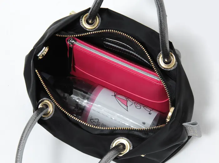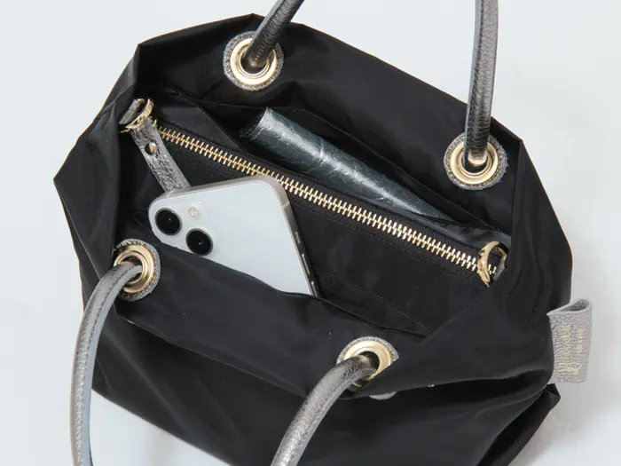 開閉は防犯面も安心のファスナー仕様。メイン収納はマチ幅がたっぷりとあり、長財布やメイクポーチなどお出かけの必需品が収まり、ペットボトルも横向きに収まります。