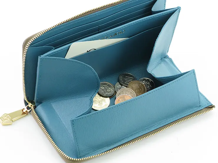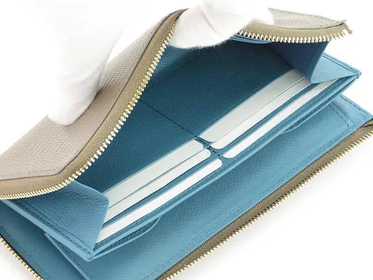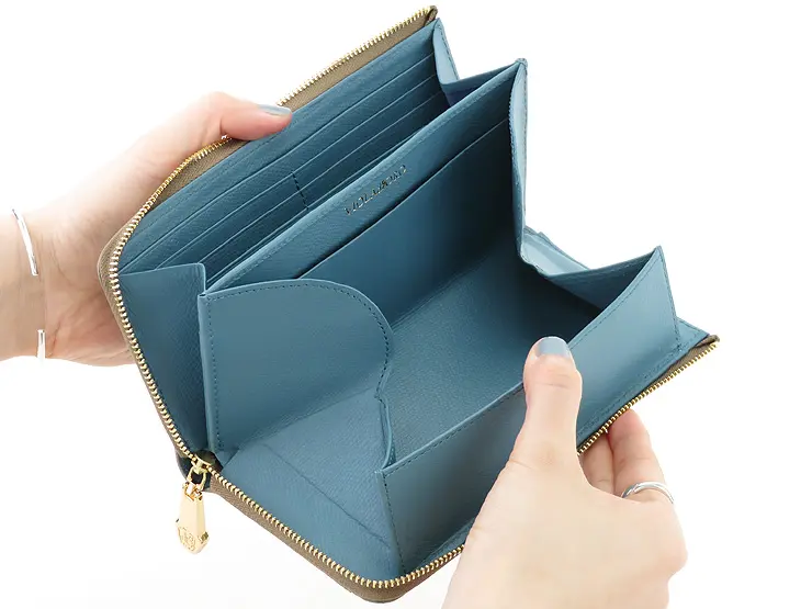 L字のファスナーを開けると、財布の中身が一度に見渡せ、支払いもスムーズに行えます。外側とは異なる配色で、開いたときのギャップも◎