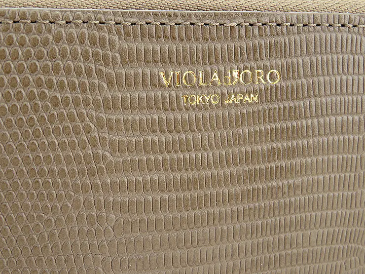 リザード(トカゲ)の型押しを施した牛革。細かなウロコの模様が繊細で、ほんのり光沢があり、ラグジュアリーな雰囲気。VIOLADOROは"VIOLA=紫"、"ORO=金"を意味し、ブランドロゴや金具もゴールドにこだわっています。