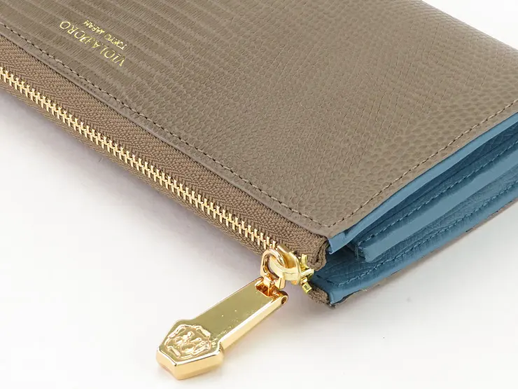 トレンドを交えながらも上品で女性らしいアイテムが揃う"VIOLAd'ORO ヴィオラドーロ"。毎日使うものだからこそ、持ったときのサイズ感や使い心地にこだわったL字ファスナー長財布。高級感のあるリザード型押しレザーと内側のカラーのコントラストが華やかで、バッグから出すたびに気分も上がりそうです。