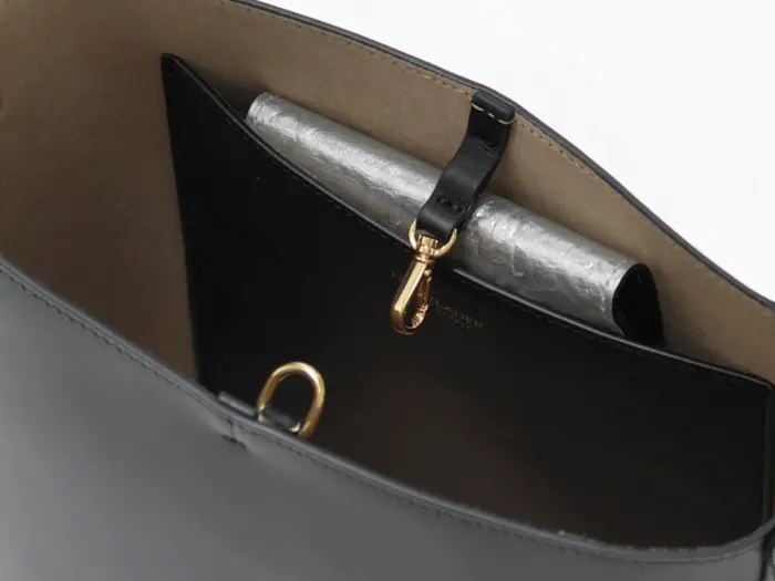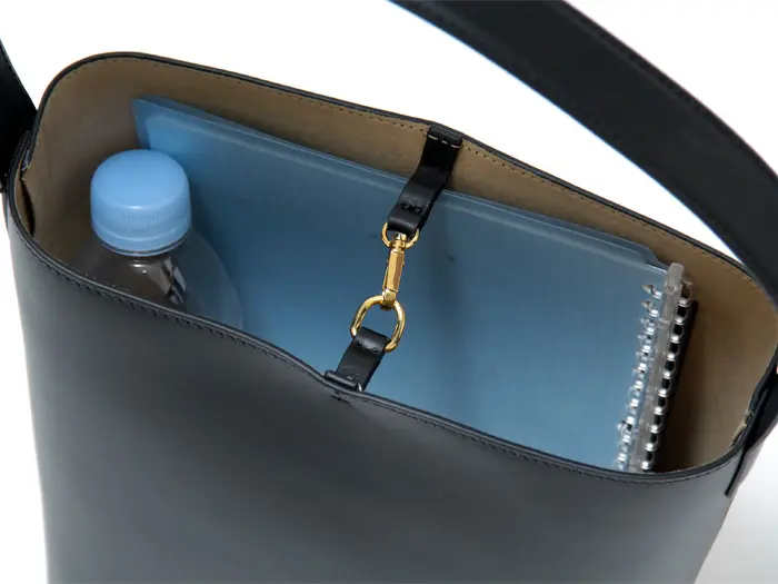 B5サイズのノートや500mlのペットボトルがぴったりと収まる、使い勝手の良いメインルームです。鞄自体が張りのある生地なので、安定感があり荷物が少なくても自立してくれます。背面内側にはオープンポケットが1つあります。手帳などの大きめサイズの荷物も収まり、鞄の中の整理が出来ます。