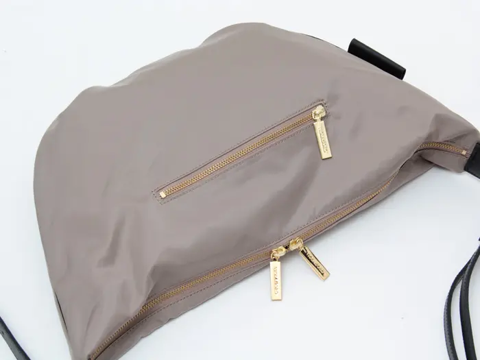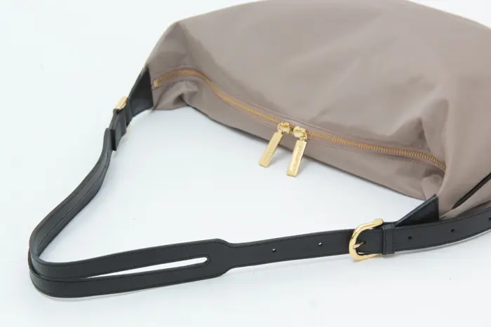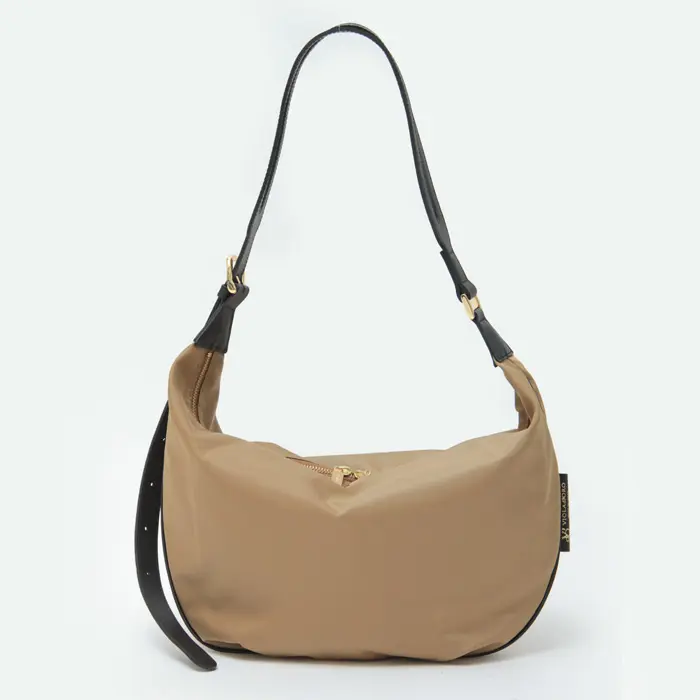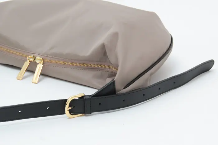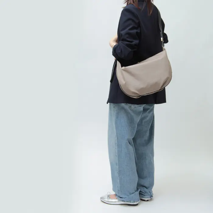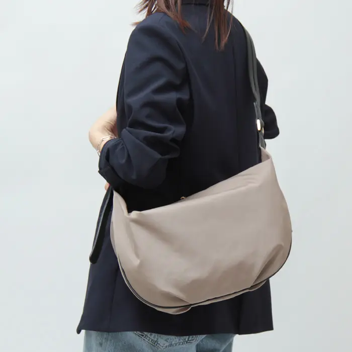 ほんのり光沢感のあるナイロン素材は柔らかく、くしゅっとした質感がこなれた雰囲気を演出します。持っていることを忘れるほどの軽さで、普段使いやお出かけ時に優しく寄り添うバッグです。弱撥水加工が施されたナイロン素材なので、少々の雨にも対応可能です。