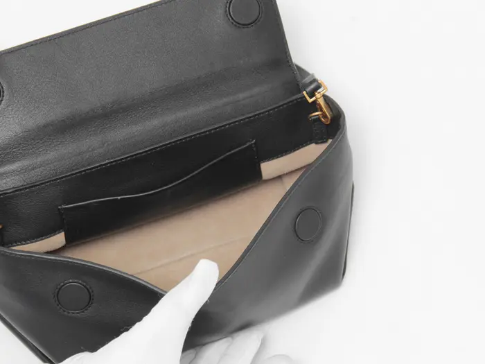 内側にはレザーのフラットポケットが備わっています。ライニングはベージュのスエード素材で、高級感があります。