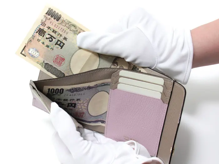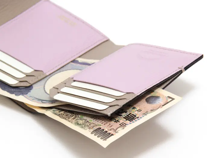 お札入れは2ヶ所。メインのお札収納はサイドの深いスリットで大きく開き、出し入れがとてもスムーズ。カード収納下のお札収納は中央の開いた個性的なデザインで、こちらも紙幣が取り出しやすい設計です。