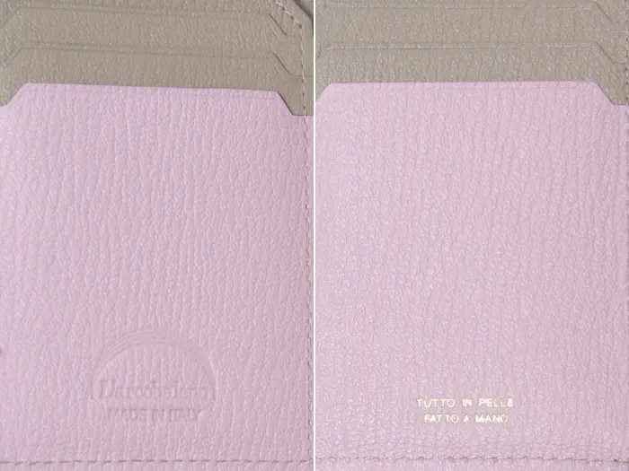 内側に素押しのラルコバレーノの刻印と、オールレザー・オールハンドメイドの証、"TUTTO IN PELLE FATTO A MANO"が刻まれています。