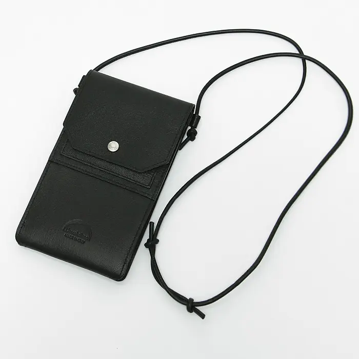 開閉はスナップボタン付きのフラップ仕様。手前側の収納は、カード収納3ヶ所、紙幣やレシートを収納できるフリーポケットが1つ装備されています。メインの収納部は間口が内寸10.5cmあり、マチがあるので多様なサイズのスマホが収納可能な容量です。