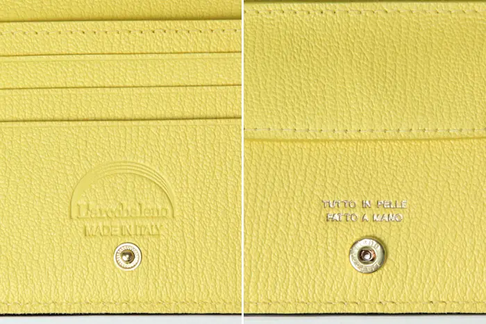 内側に素押しのラルコバレーノの刻印と、オールレザー・オールハンドメイドの証、"TUTTO IN PELLE FATTO A MANO"が刻まれています。