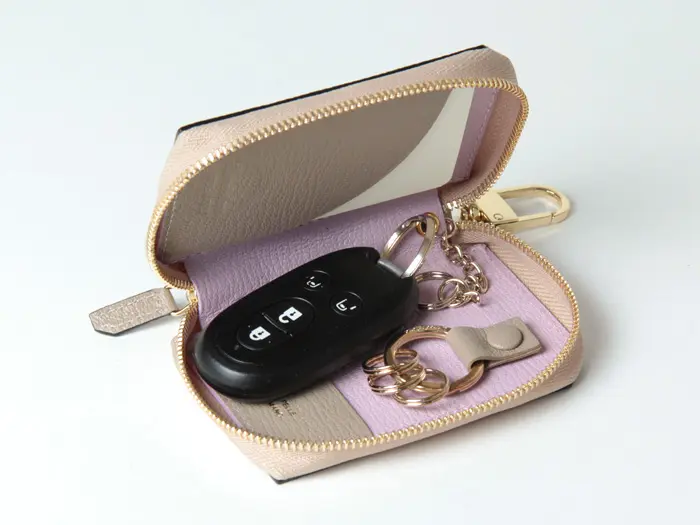 キーケースを開くと、中央に落下防止のチェーンを付属しており、安心してスマートキーを収納できます。