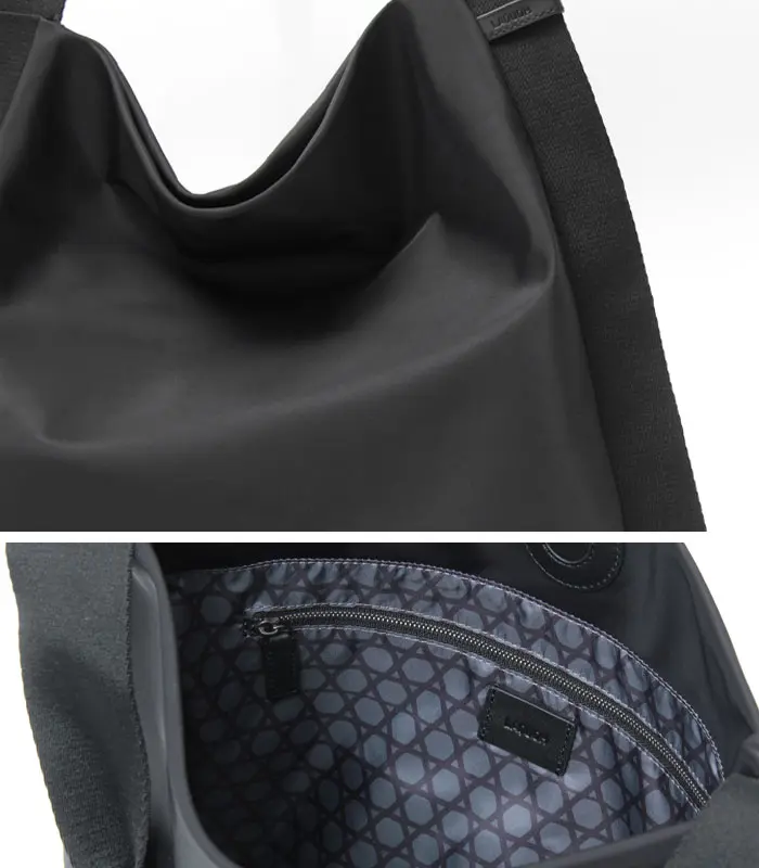 幅広のテープのみをアクセントにシンプルに仕立てた"LAQUOH /ラクーオ"のナイロントート。Lサイズは、スリムなスタイルながら、A4サイズが収まるお仕事用にも嬉しいサイズ。ナイロン素材の軽い持ち心地と柔らかな光沢が大人スタイルにマッチし、突然の雨でも安心して使える撥水性に優れた実用的なバッグです。