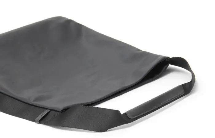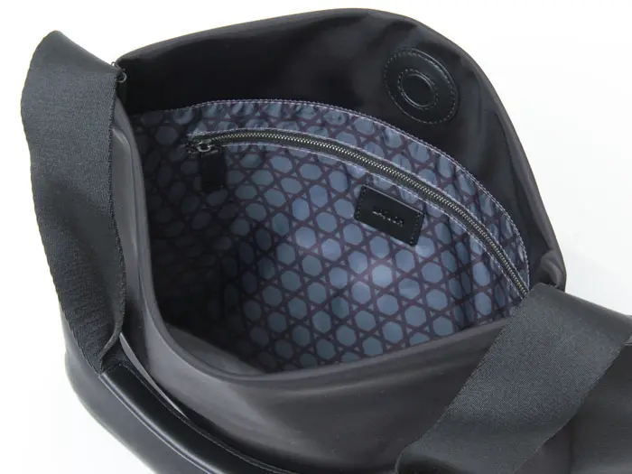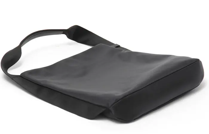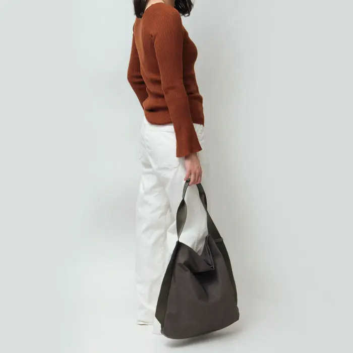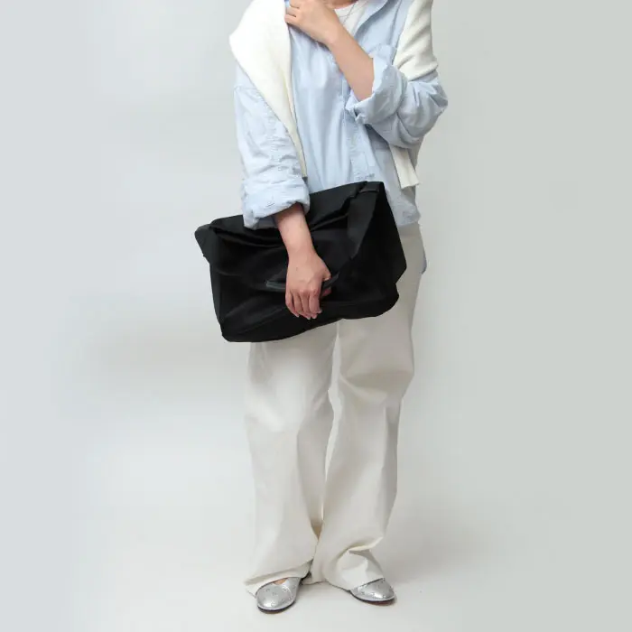 程よい太さのハンドルは、肩掛けが可能。しなやかなナイロン素材を使用しているため持った時にかさばらず、小脇に収まりやすいデザインが魅力です。また、手が触れる部分には柔らかな質感の牛革を施し、高級感と持ちやすさを兼ね備えています。