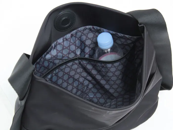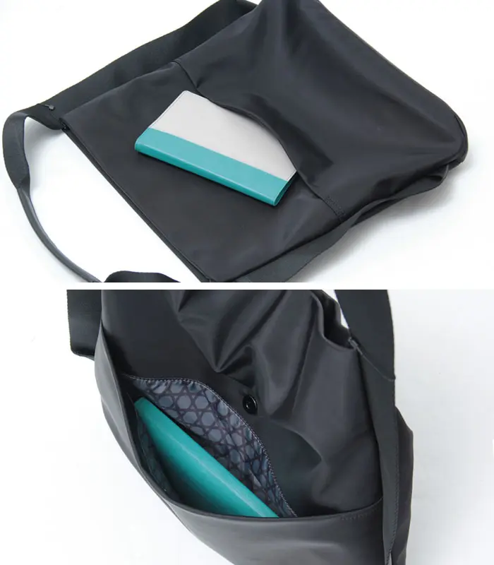 開閉はワンタッチで開くマグネット仕様で、荷物の出し入れもスムーズです。A4サイズのファイルやノートパソコンも収納可能で、薄マチながら荷物に合わせて柔軟に膨らみ、お弁当箱も収まります。内ポケット付きで、スマホやICカードなどの小物も整理して収納できます。 オープンポケットはボトルホルダーではありませんが、十分な大きさがあり、500mlのペットボトルも収納可能です。