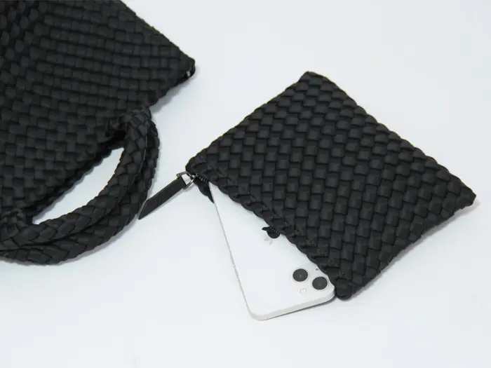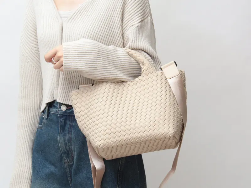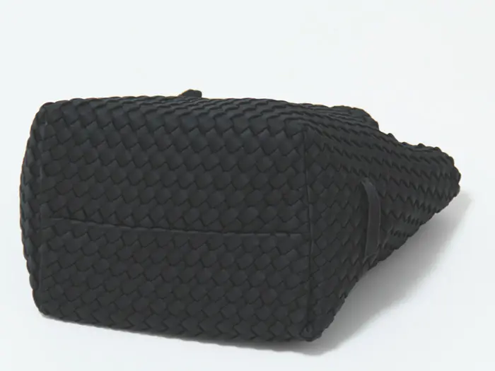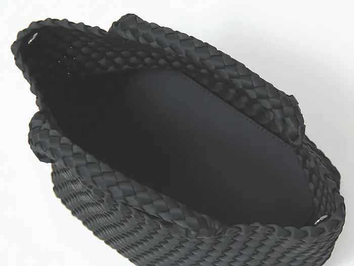 本体に使用されている素材は合成ゴム素材の1つで、断熱性、保温性、伸縮性に優れた素材です。そのレザーに劣らない高級感と、レザーにはない柔らかさと軽やかさのある素材を丁寧に編み込み、軽量で丈夫な作りとなっています。