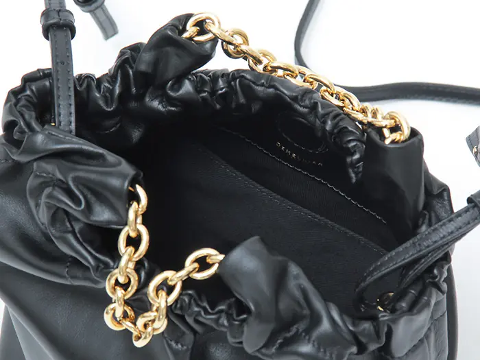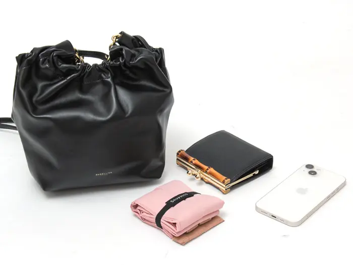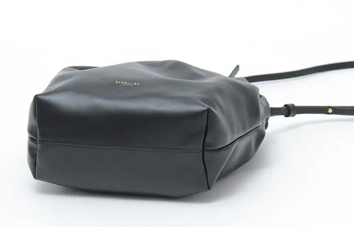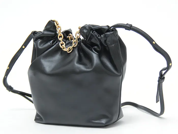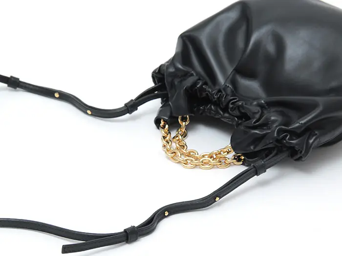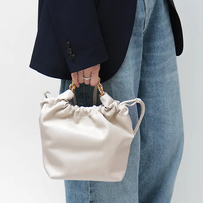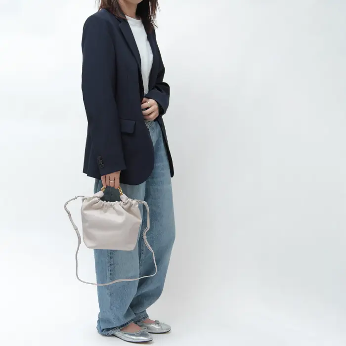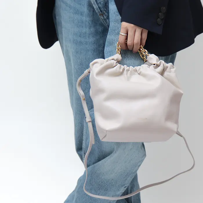 柔らかく滑らかなスムースレザーを使用。サステナブルなイタリアンレザーから手作りされた、繊細できめ細やかな最高級素材です。口元にギャザーを寄せることで、バッグがふっくらとし、女性らしい印象を与えてくれます。