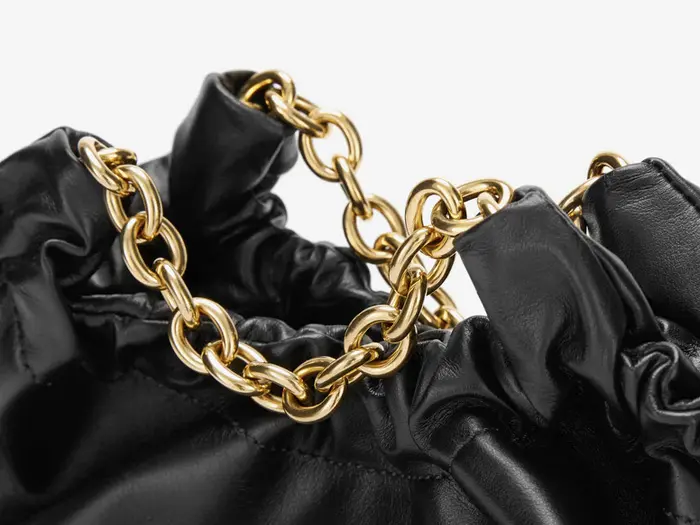 ゴールドメッキのチャンキーキャリーチェーンは、重厚感があり、洗練された印象を与えます。取り外し可能で、長さ調節ができるショルダーストラップが付属しており、コーディネートやお出かけのシーンに合わせて持ち方を変えられる便利なデザインです。