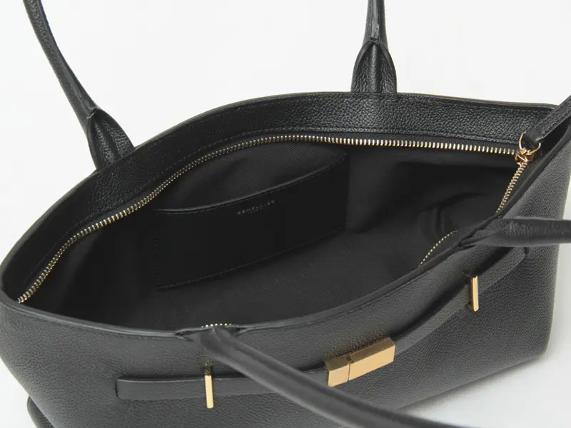 本体には厚みがありながらもソフトな質感が特徴のスモールグレインカウハイドレザーを採用。イタリアの皮なめし工場から独占的に調達した、EU規制に準拠した最高品質の本革を使用し、熟練職人の手で丁寧に仕上げられています。しっかりとしたレザーなので安定感があり、荷物を入れてもバッグの形を崩さず綺麗なシルエットのままお持ちいただけます。